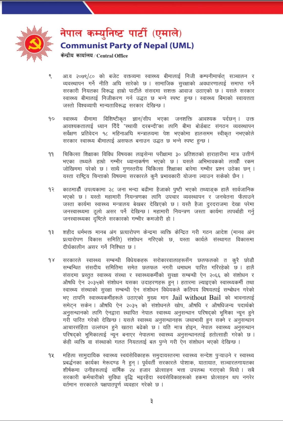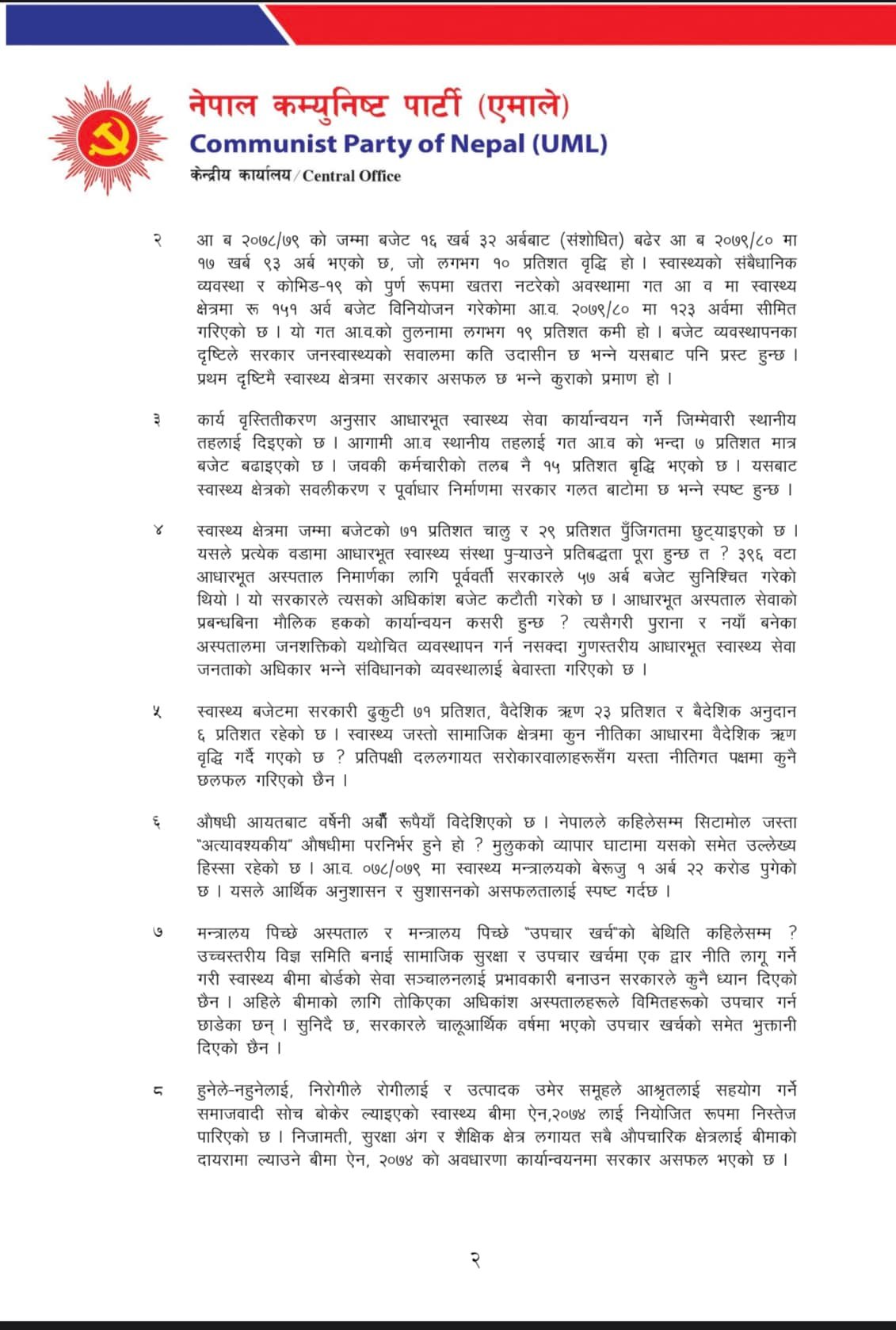 एमालेले स्वास्थ्य क्षेत्रमा सरकार प्रथम दृष्टिमै असफल भएको जनाएको छ । ‘गत आ.व.मा स्वास्थ्य क्षेत्रमा १५१ अर्व बजेट विनियोजन गरेकोमा आ.व. २०७९/८० मा १२३ अर्वमा सीमित गरिएको छ । यो गत आ.व.को तुलनामा लगभग १९ प्रतिशत कमी हो । बजेट व्यवस्थापनका दृष्टिले सरकार जनस्वास्थ्यको सवालमा कति उदासीन छ भन्ने यसबाट पनि प्रस्ट हुन्छ । प्रथम दृष्टिमै स्वास्थ्य क्षेत्रमा सरकार असफल छ भन्ने कुराको प्रमाण हो,’ विज्ञप्तिमा भनिएको छ ।