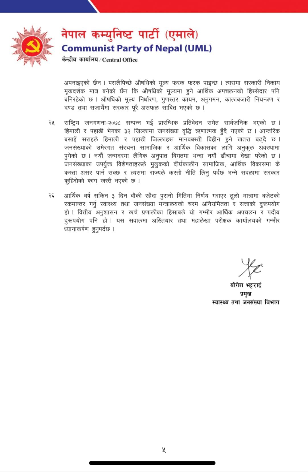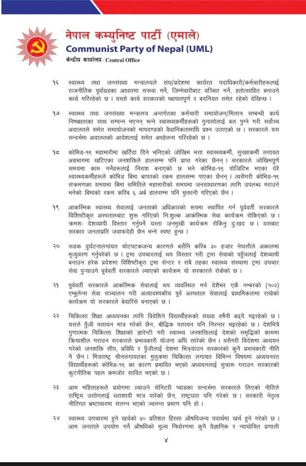 एमाले स्वास्थ्य तथा जनसंख्या बिभागले शुक्रबार पार्टी केन्द्रीय कार्यालयमा पत्रकार सम्मेलन गरी सचिवसमेत रहेका विभाग प्रमुख योगेश भट्टराईले २६ बुँदामा सरकारको विरोध गरेका हुन् । उनले सरकारको असक्षमताका कारण कोभिडको १० लाख डोज खेर गएको र अब चाँडै २० लाख खोप म्याद सकिएर फाल्नुपर्ने अवस्थामा पुगेको दाबी गरेका छन् ।