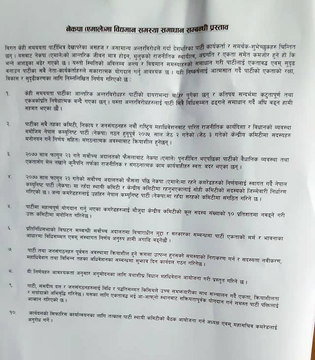 सहमतिको पहिलो बुँदामा पार्टीभित्रका अन्तरविरोधहरुलाई पार्टी भित्रै विधिसम्मत ढंगले समाधान गर्दै अघि बढ्न हामी सहमत भएको उल्लेख गरिएको छ । त्यस्तै, नेपाली कम्युनिस्ट पार्टी (नेकपा) गठन हुनुपूर्व २०७५ साल जेठ २ गतेको (जेठ ३ गतेको केन्द्रीय कमिटी सदस्यहरु मनोनयन गर्ने निर्णयसहित) संगठनात्मक अवस्थाबाट क्रियाशिल हुने भनिएको छ ।
