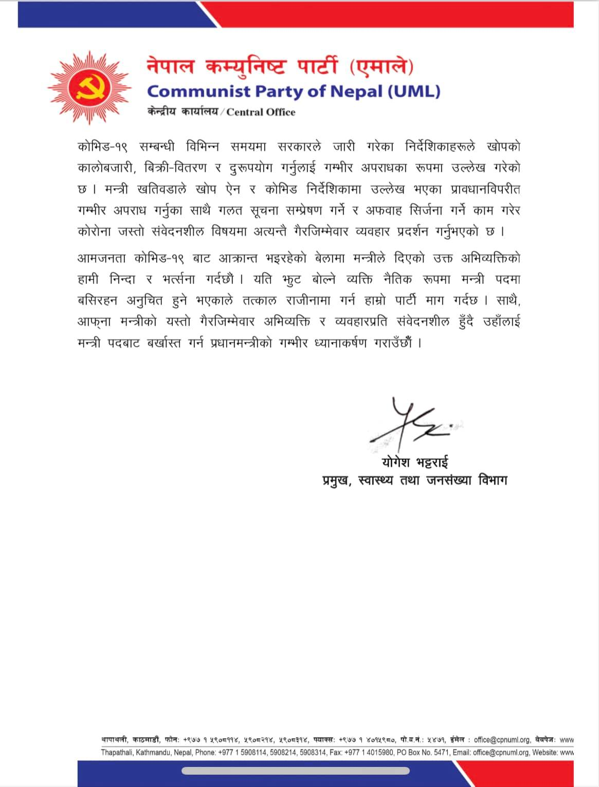उनको अभिव्यक्ति गैरजिम्मेवार रहेको र यस्तो झुठो बोल्ने व्यक्ति मन्त्रीजस्तो गरिमामय पदमा बसिरहन नहुने भन्दै एमालेले राजीनामा मागेको हो ।