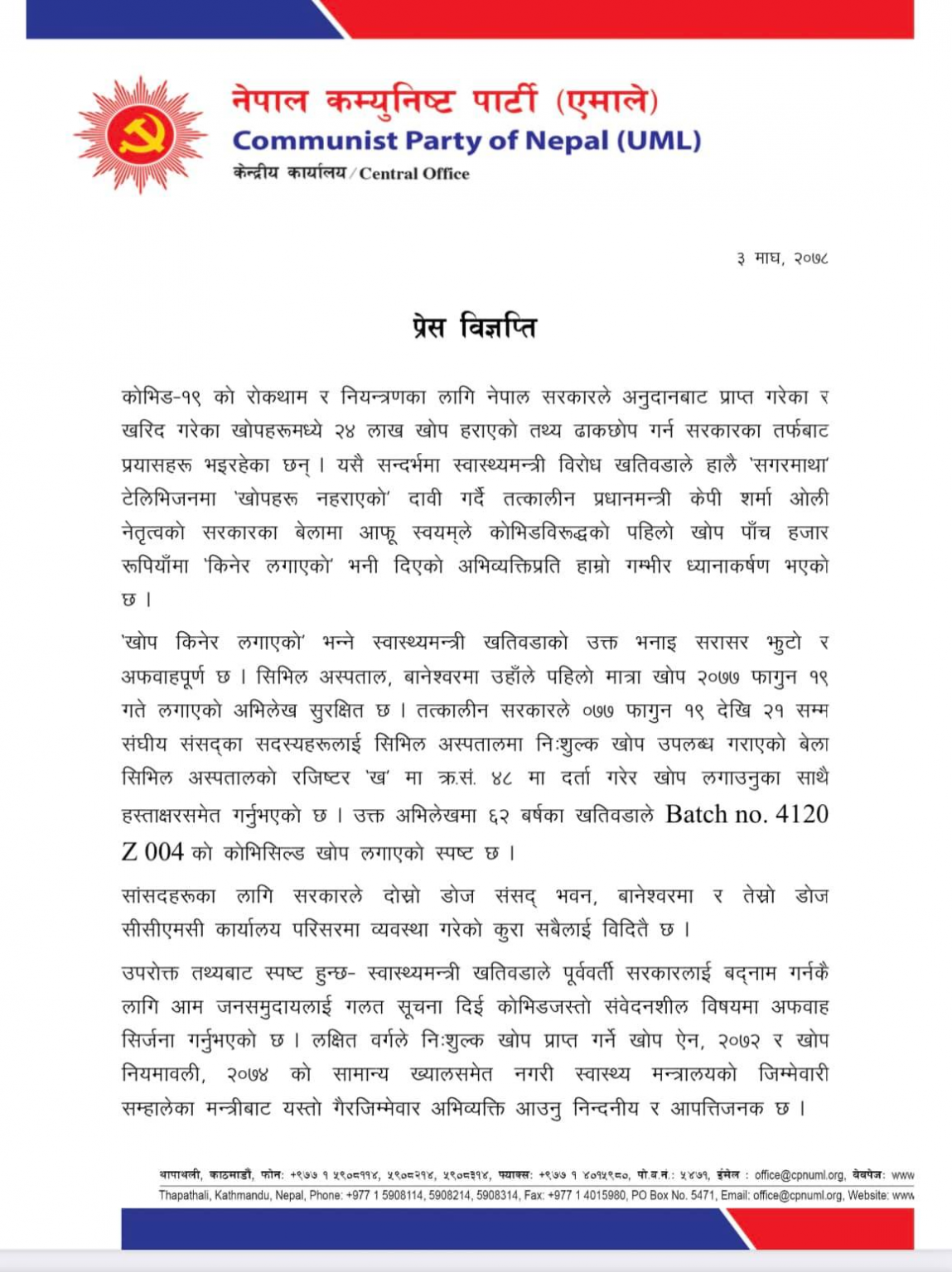 कोरोना खोपबारे स्वास्थ्यमन्त्रीले झुटो बोलेको प्रमाण सार्वजनिक, एमालेले माग्यो राजीनामा