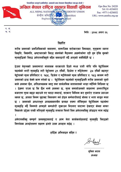 “पेट्रोलियम पदार्थको मूल्यवृद्धिसंगै गरीब जनताको चुलो बल्ने अवस्था छैन, अतिआवश्यक वस्तु तथा सार्वजनिक यातायातको भाडा महँगिने निश्चित छ । देशमा राज्य छ कि छैन भन्ने अवस्था छ, मुल्य समायोजनको बाहनामा अन्तर्राष्ट्रिय बजारमा मुल्य बढ्दा बढाउने तर घटदा नघटाई, सरकार विभिन्न कर थुपारेर राजस्व उठाउन व्यस्त छ, आयल निगम चुहावट नियन्त्रण गर्न होइन कर्मचारीलाई बोनस र भत्ता बाड्न मस्त छ । जनताको आधारभूत आवश्यकतासँग प्रत्यक्ष रुपमा गाँसिएका पेट्रोलियम पदार्थमा मूल्यवृद्धि गर्दै निगमले आफ्नो कमजोरी लुकाउन निरन्तर घाटामा देखाएर केवल नाफा निकाल्ने उद्देश्य राखी गरिएको मूल्यवृद्धि तत्काल फिर्ता लिन अनेरास्ववियु जोडदार माग गर्दछ ।” विज्ञप्तीमा उल्लेख गरीएको छ ।