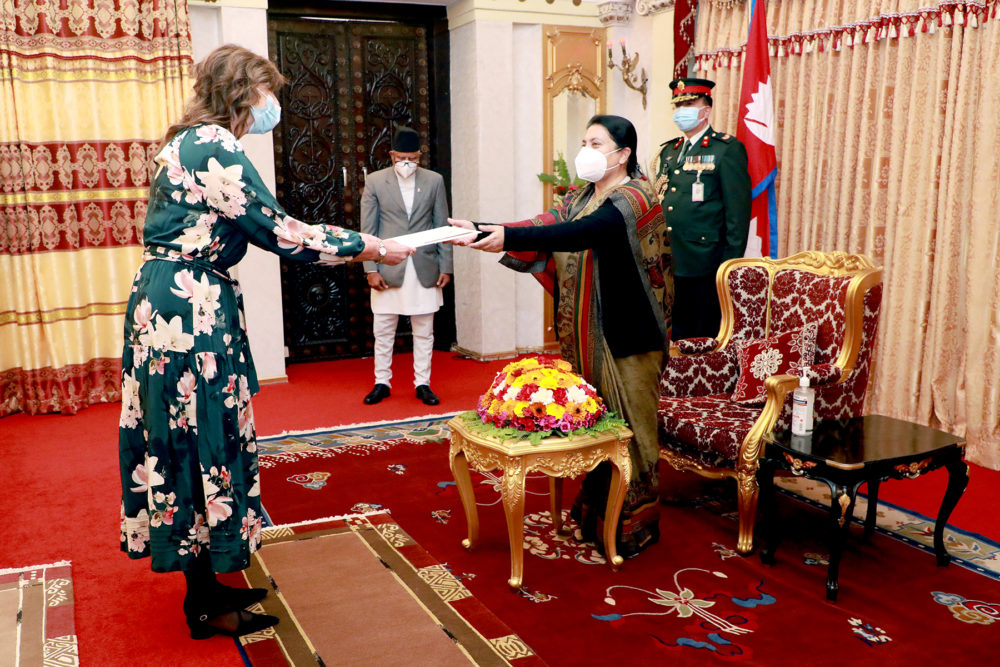 राष्ट्रपति भवन, शीतल निवासमा आज आयोजित विशेष समारोहमा पाकिस्तानी राजदूत सैद हैदर शाह र अष्ट्रेलियाका राजदूत फेलिसिटी जेन भल्कले प्रमाणपत्र पेश गरेका हुन् । सो अवसरमा परराष्ट्रमन्त्री प्रदीपकुमार ज्ञवाली, नेपाल सरकारका उच्चपदस्थ अधिकारी लगायतको उपस्थिति थियो ।