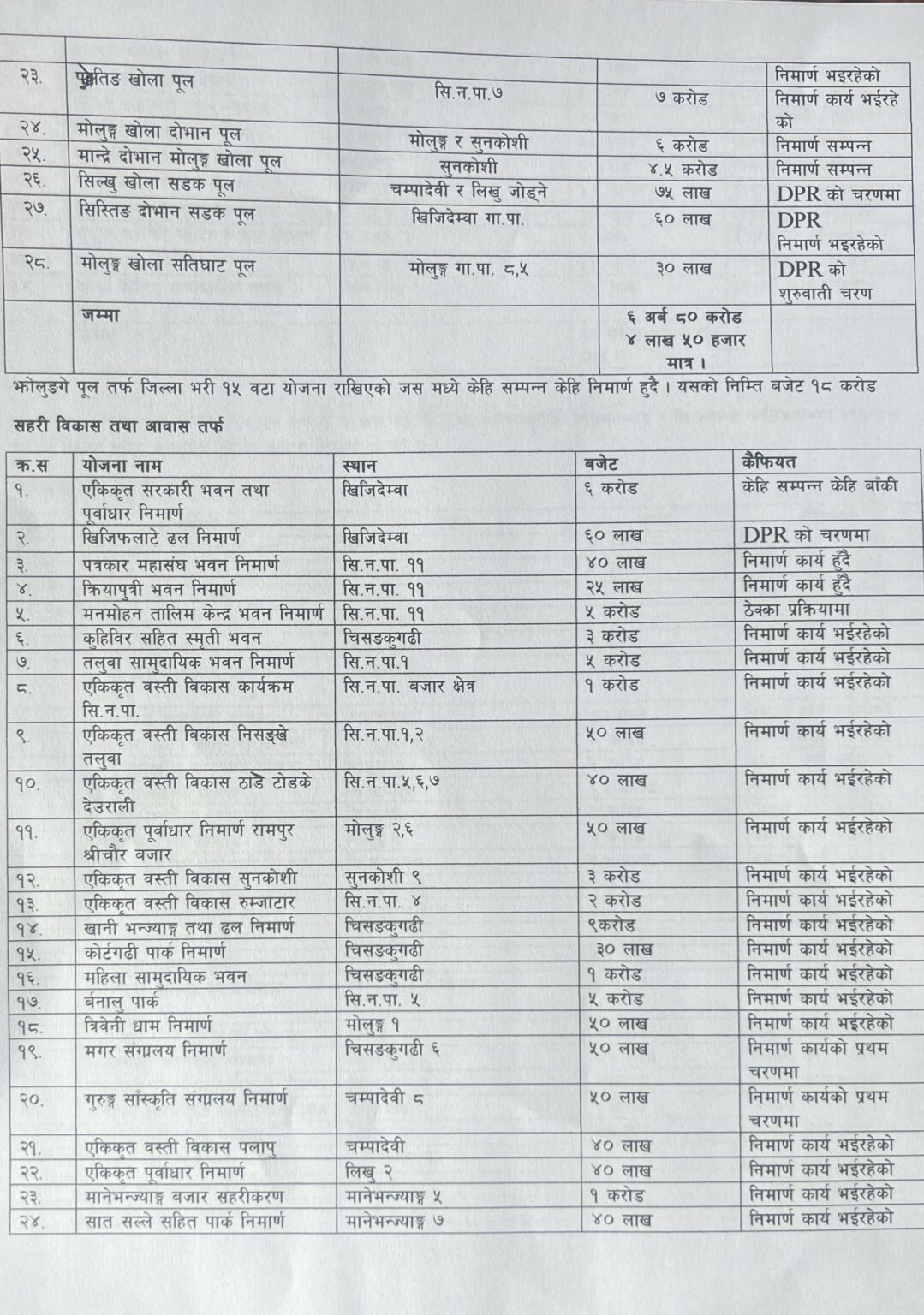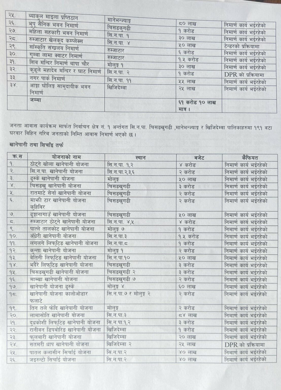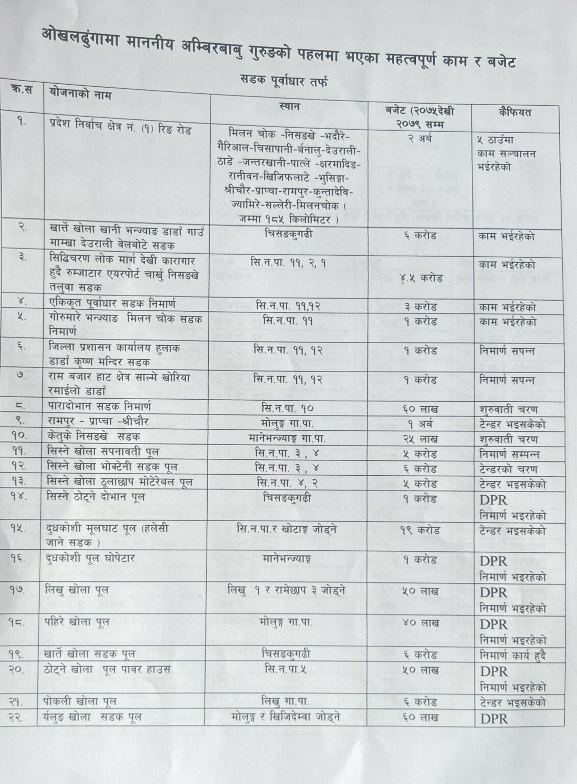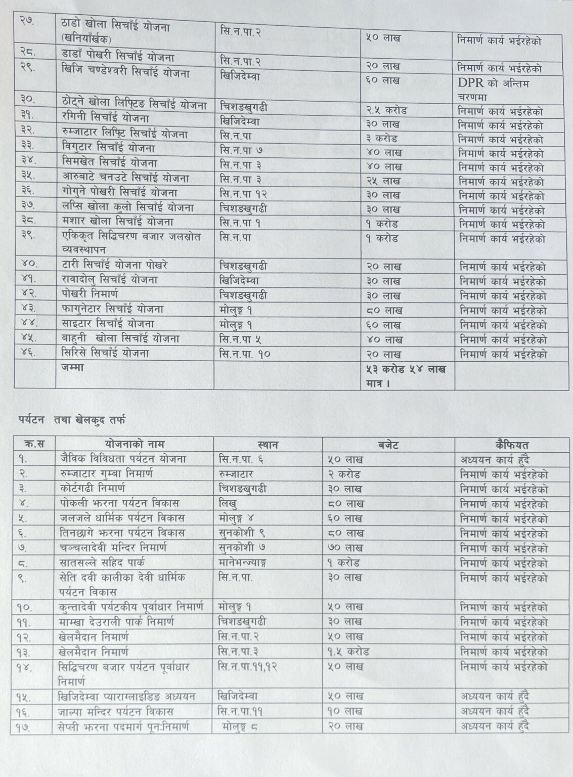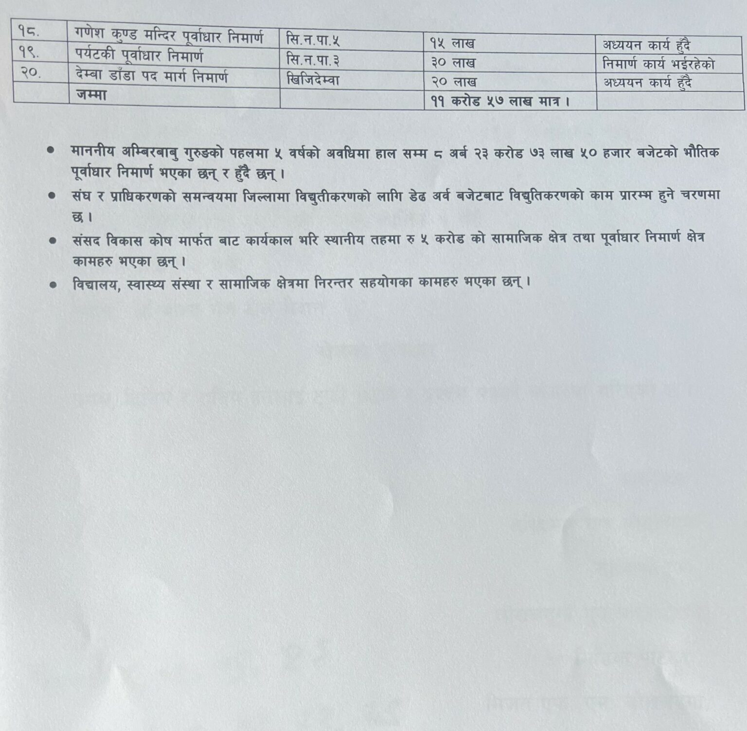 उनले पूर्वाधार विकास, खानेपानी, सिंचाई, सहरी विकास तथा आवास, पर्यटन तथा खेलकुद र विद्युतीकरण लगायतका शिर्षकमा जिल्लामा बजेट ल्याएका छन् ।