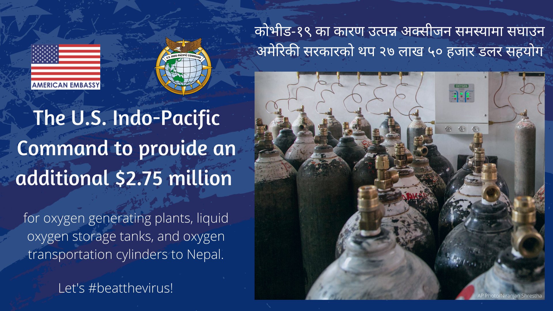 अमेरिकी दूतावासकाअनुसार अमेरिकी इन्डो–प्यासेफिक कमान्डले कोरोना भाइरसको संक्रमण नियन्त्रण तथा रोकथामका लागि अक्सिजन सिलिन्डर, प्लान्ट र भण्डार ट्यांकहरु सहयोगको घोषणा गरेको हो ।