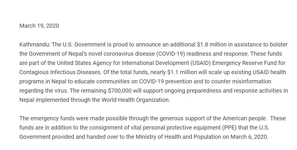 कोरोनाको संक्रमणबाट बच्न नेपाललाई अमेरिकाको २० करोड सहयोग