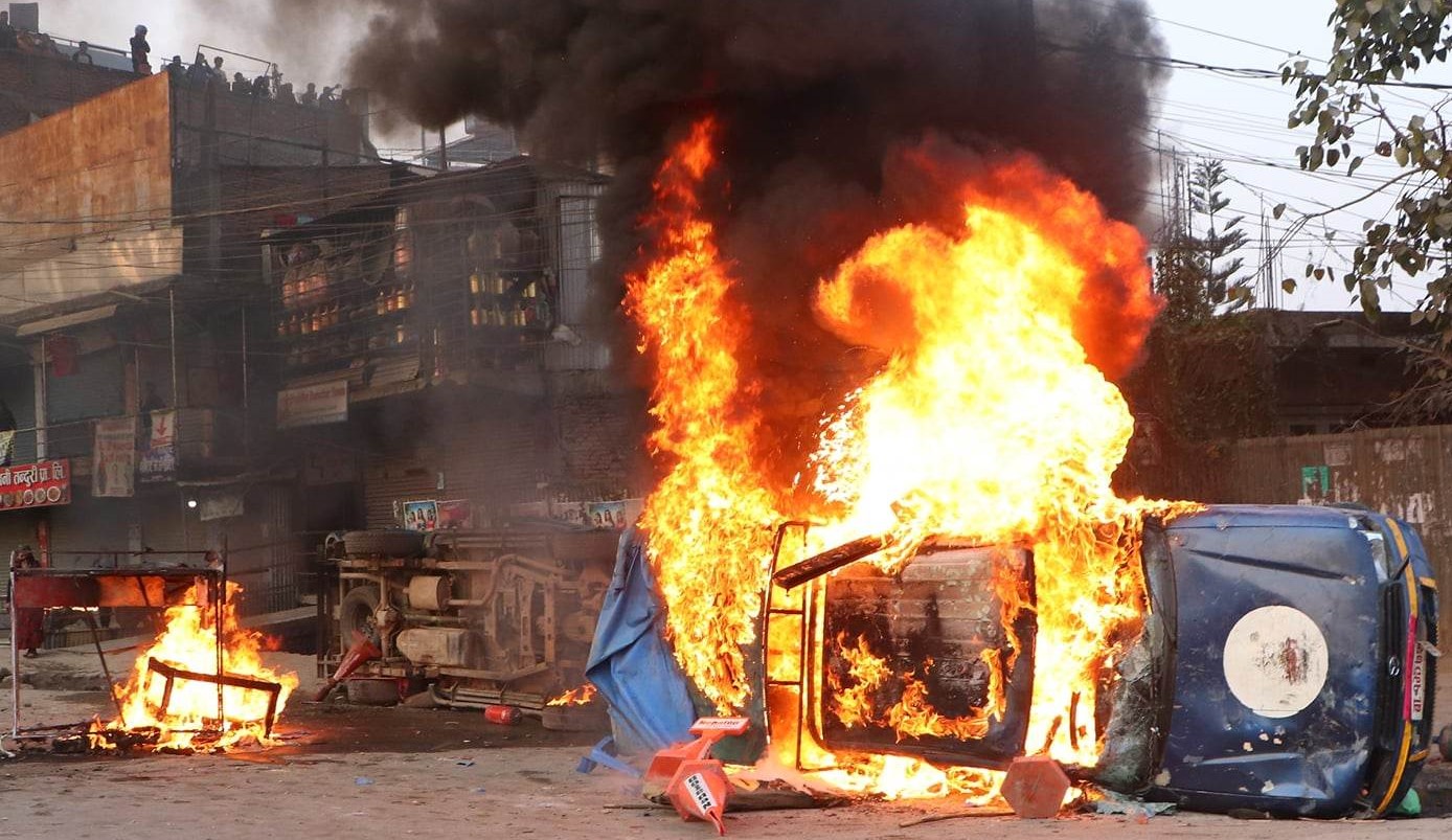 यातायात व्यवसायी तथा मजदुरहरूले ट्राफिक प्रहरीले लागू गरेको सवारी नियमविरुद्ध प्रदर्शन गर्दा भएको दोहरो झडपमा आन्दोलित उनीहरुले नेपाल प्रहरीको दुई वटा गाडीमा आगजनी गरेका हुन्।