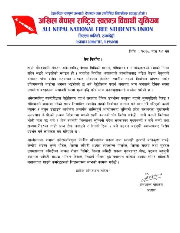 अनेरास्ववियुले मंगलबार रूपन्देहीमा लुम्बिनी प्रदेशका मुख्यमन्त्री, मन्त्री तथा राज्यमन्त्रीका गाडी चल्न रोक लगाउने र २ बजे बुटवल बहुमुखी क्याम्पसबाट विरोध प्रदर्शन गर्ने कार्यक्रम तय गरिएको अध्यक्ष शेषकान्त पोखरेलले बताए ।