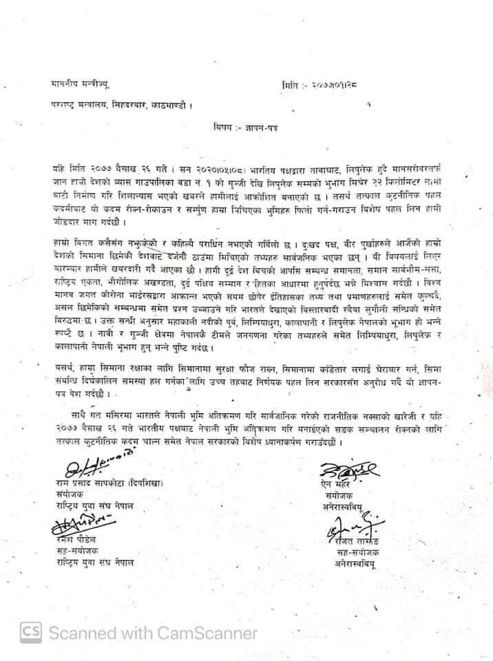 आइतबार परराष्ट्रमन्त्री प्रदीपकुमार ज्ञवालीलाई ज्ञापनपत्र बुझाउँदै राष्ट्रिय युवा संघ नेपाल र अनेरास्ववियूले सिमाना रक्षा गर्न सुरक्षा फौज राख्न र काडेतार लगाई घेराबार गर्न आग्रह गरेको हो ।