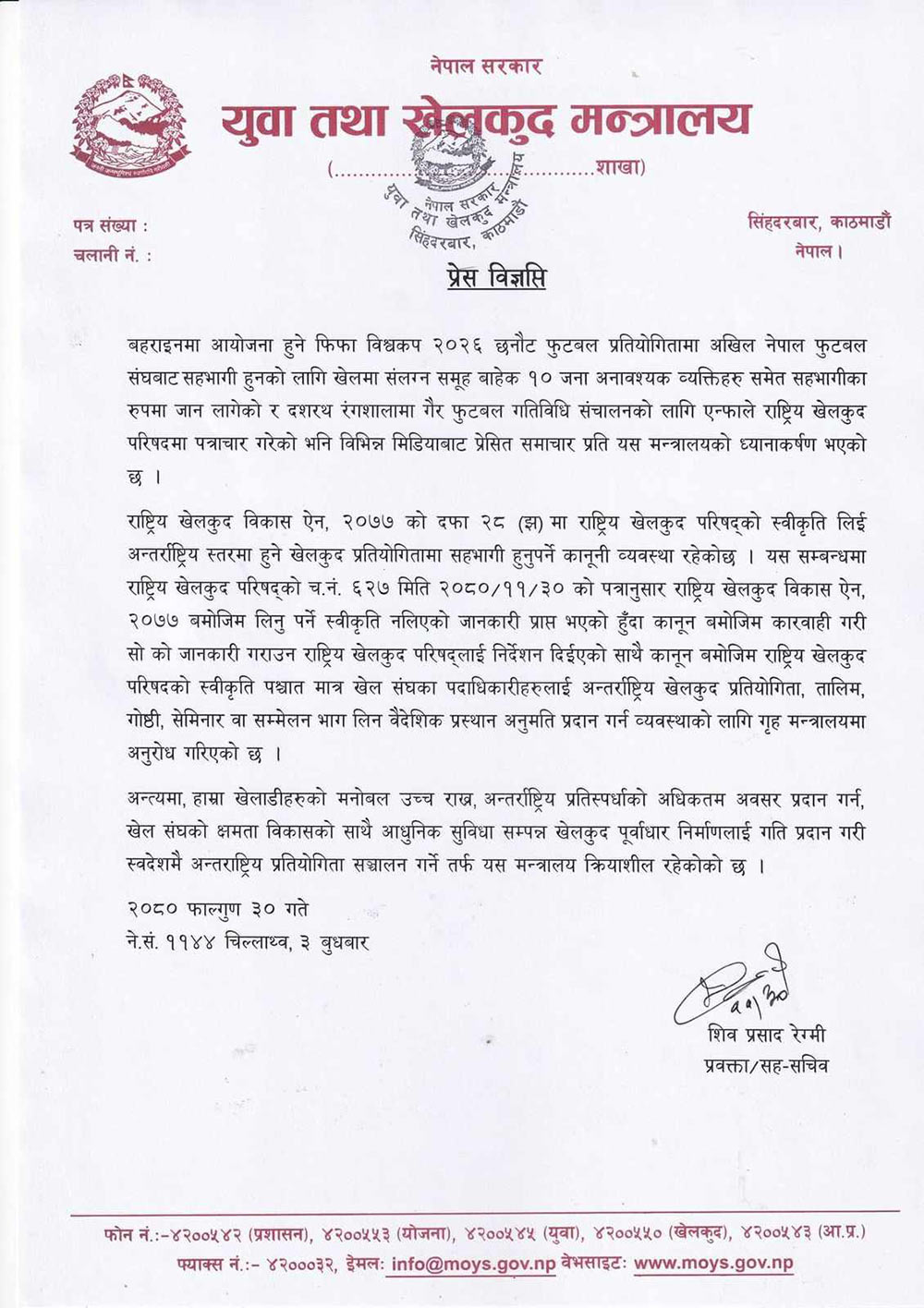 राष्ट्रिय खेलकुद विकास ऐन, २०७७ को दफा २८ को “झ’मा राष्ट्रिय खेलकुद परिषद् (राखेप)को स्वीकृति लिनुपर्नेमा व्यवस्था भएबमोजिम एन्फाले सो प्रक्रिया पूरा नगरी विदेश गएकाले मन्त्रालयले एन्फालाई कारबाही गर्ने राखेपलाई निर्देशन दिएको हो ।