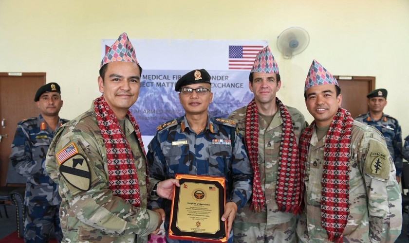 काठमाडौं – अमेरिकी सेना र सशस्त्र प्रहरी बलबीच पहिलो प्राथमिक उपचारसम्बन्धी तालिम सम्पन्न भएको छ । चैत २५ देखि २९ गतेसम्म सञ्चालित साताव्यापी विषयविद् आदानप्रदान युएस स्पेशल अपरेशन्स कमान्ड–प्यासिफिक र सशस्त्र प्रहरी बलबीचको नयां साझेदारीको सुरुवात भएको हो। उक्त तालिमबाट दुवै देशका अधिकारीहरु लाभान्वित भएको जनाइएको छ ।