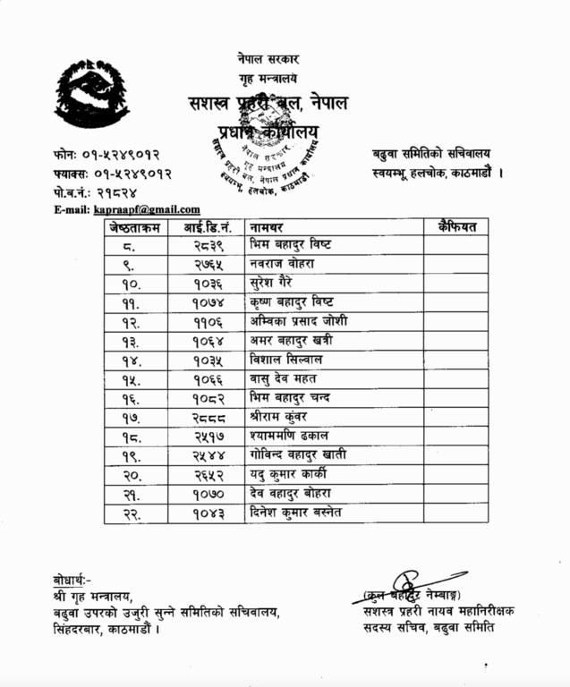 काठमाण्डु – सशस्त्र प्रहरीले एसएसपी र एसपी पदमा बढुवा सिफारिस गरेको छ । सशस्त्र प्रहरी महानिरीक्षक राजु अर्यालले सशस्त्रमा बढुवा वरियता र कार्यसम्पादनका आधारमा गरेका हुन् ।