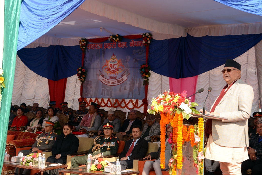 समारोहलाई सम्बोधन गर्नुहुँदै प्रधानमन्त्री ओलीले सशस्त्र प्रहरी बल, नेपालले स्थापनाको छोटो समयमा नै प्रदर्शन गरेको देश भक्ति, कर्तव्य परायणता र क्षमताले संगठनको स्थापनाको औचित्य पुष्टि गरिसकेको चर्चा गर्नुहुँदै संगठनलाई आजको यस अवस्थामा ल्याईपु¥याउन सम्पूर्ण सकल दर्जाका राष्ट्रसेवक सशस्त्र प्रहरी कर्मचारीहरुको असाधारण मेहनत, परिश्रम र बीरता प्रदर्शनको उल्लेखनिय भूमिका रहेको बताउनुभयो ।