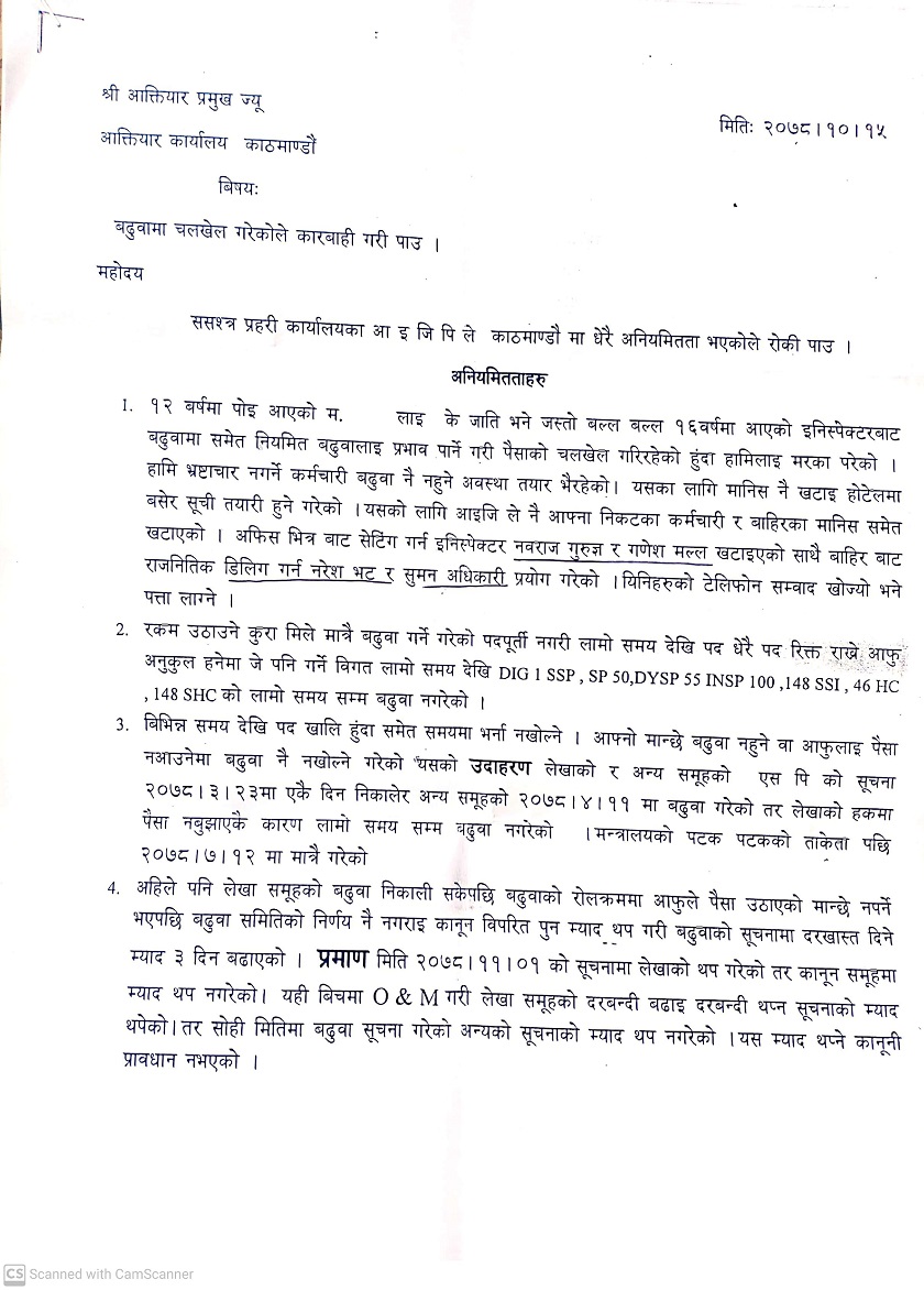 १६ वर्षमा इन्स्पेक्टरबाट डीएसपीमा बढुवा हुन लागेकाहरूलाई नियमित बढुवा नगरेर आईजीपी निकट मानिसहरुले आर्थिक चलखेल गरेको उजुरकर्ताको आरोप छ । बढुवामा आर्थिक चलखेल गर्न संगठन भित्रबाट इन्स्पेक्टर नवराज गुरुङ र गणेश मल्ल तथा बाहिर नरेश भट्ट र सुमन अधिकारीलाई आईजीपीले नै प्रयोग गरेको उजुरकर्ताले दावी गरेका छन् ।