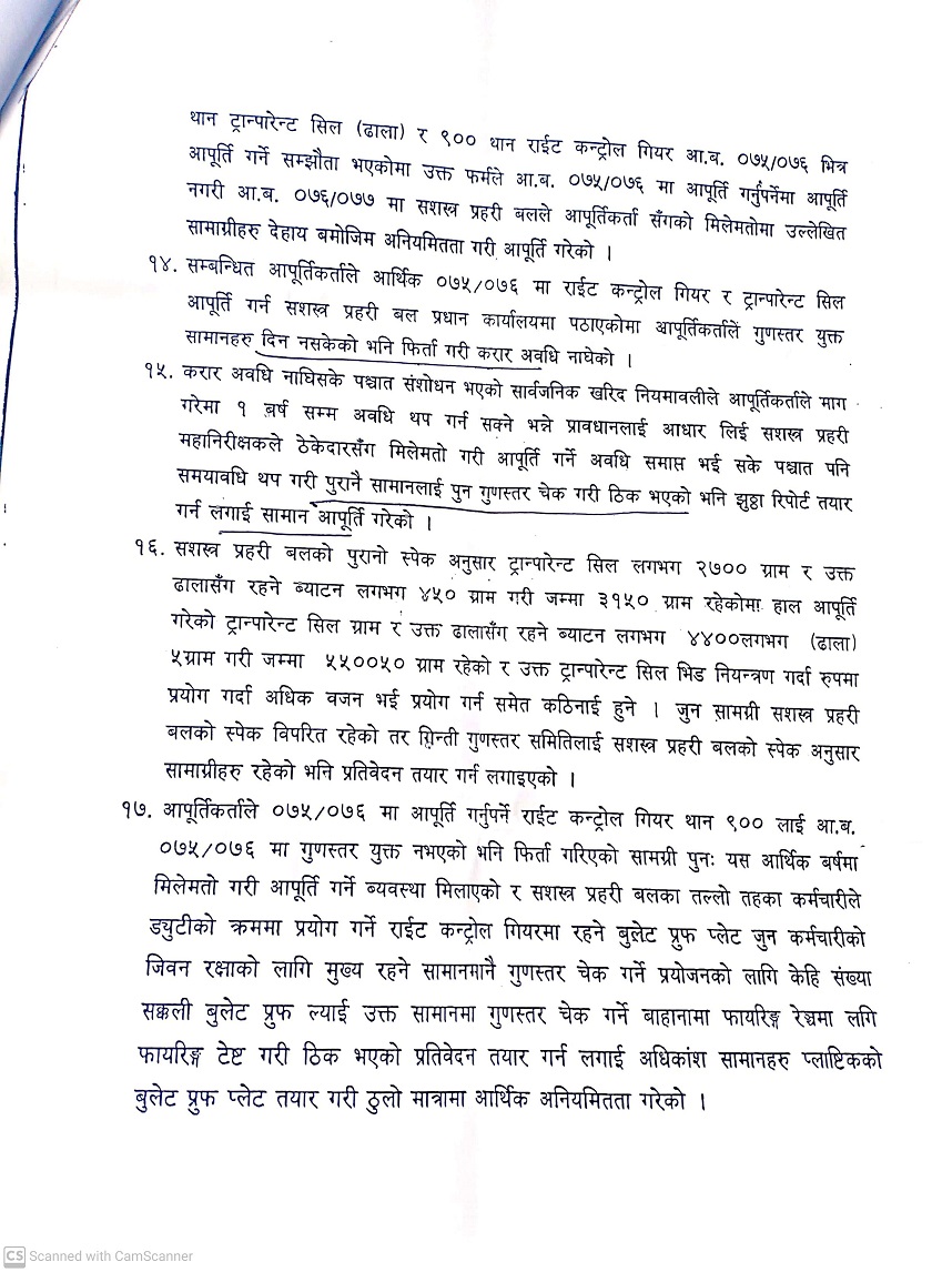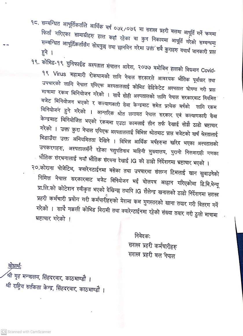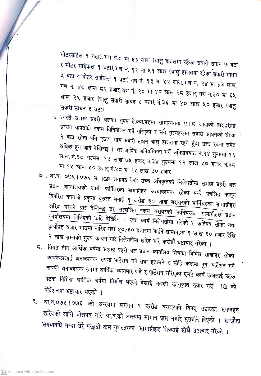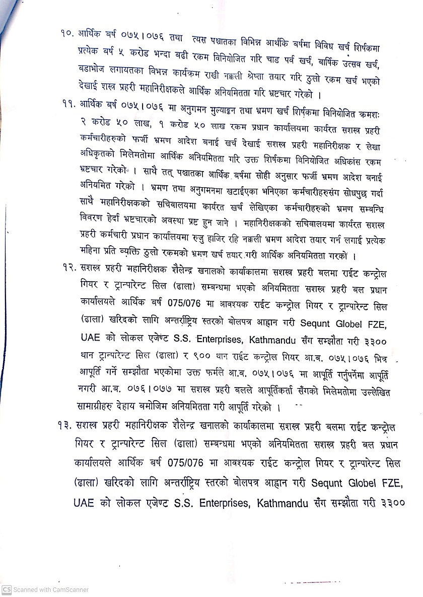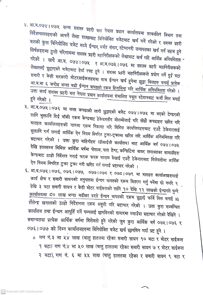 ‘इन्धनको झुटो बिल बनाएर प्रत्येक आर्थिक वर्षमा ६ करोड भन्दा बढी इन्धन बापतको रकम हिनामिना गरी आर्थिक अनियमितता गरिएको छ । सो कार्यमा सशस्त्र प्रहरी बल नेपाल प्रधान कार्यालयमा संचालित फ्युल स्टेशनबाट फर्जी विल बनाउने गरिन्छ,’ अख्तियारमा परेको उजुरीमा भनिएको छ ।