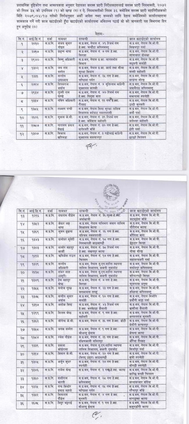 काठमाण्डु – सशस्त्र प्रहरी मुख्यालयले इन्सपेक्टरहरुको सरुवा गरेको छ । मंगलवार सशस्त्र प्रहरीको मुख्यालयले ४ सय २८ जना इन्सपेक्टरहरुको सरुवा गरेको हो ।
