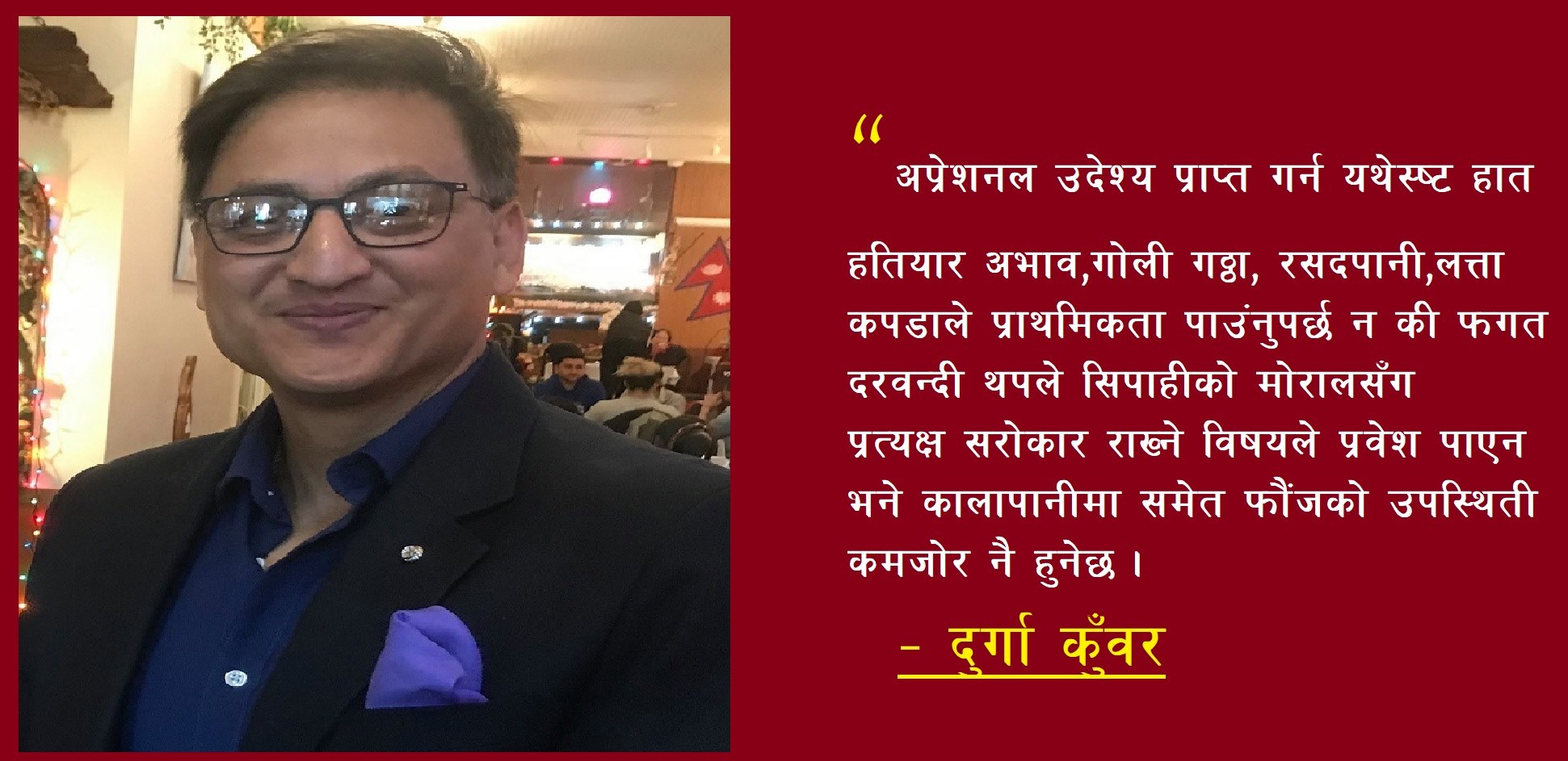 दरवन्दी थप गर्नुभन्दा पनि आवश्यकताअनुसार फौजलाई रि डिप्लोयामेण्ट गर्न जरुरी छ । अप्रेशनल उदेश्य प्राप्त गर्न यथेस्ष्ट हात हतियार अभाव,गोली गठ्ठा, रसदपानी,लत्ता कपडाले प्राथमिकता पाउंनुपर्छ न की फगत दरवन्दी थपले सिपाहीको मोरालसंग प्रत्यक्ष सरोकार राख्ने विषयले प्रवेश पाएन भने कालापानीमा समेत फौंजको उपस्थिती कमजोर नै हुनेछ ।