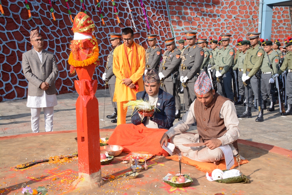 बिहान ७ बजेर ११ मिनेटको पुजाको संकल्प साइतमा गरिएको निशान तथा मौलो पुजा कार्यक्रममा खनालले सशस्त्र प्रहरी बल, नेपालको निशानमा पञ्जाछाप लगाए । सशस्त्र प्रहरी व्याण्डको मंगलधुनबीच सुरु भएको पुजा कार्यक्रममा सशस्त्र प्रहरीको एक टोलीले निशान भगवती सलामी अर्पण गरेको थियो ।