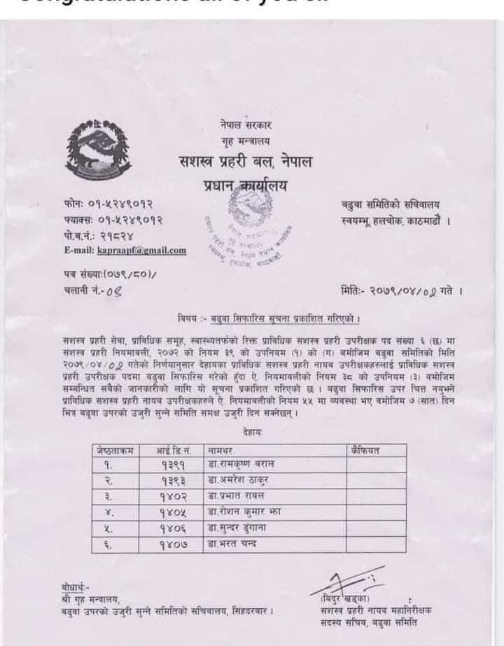 सोमबार हलचोकमा बसेको बढुवा समितिको बैठकले प्राविधिक समूह स्वास्थ्यतर्फका ६ डिएसपीलाई प्रहरी उपरीक्षक (एसपी)मा बढुवा गर्न सिफरिस गरेको हो ।