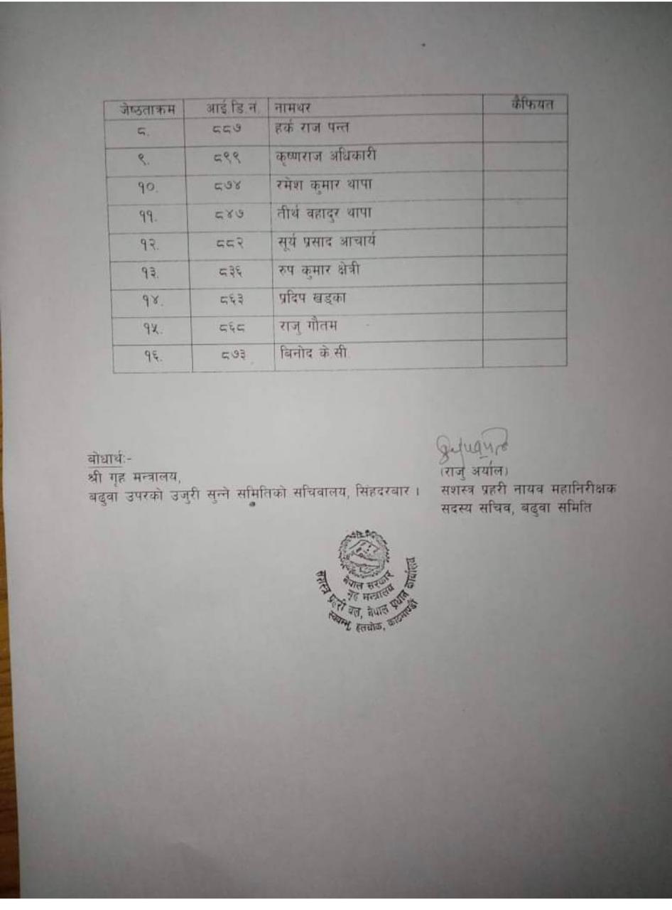काठमाण्डु – सशस्त्र प्रहरी उपरीक्षक (एसपी)बढुवाका लागि १६ जनाको नाम सिफारिस भएको छ ।