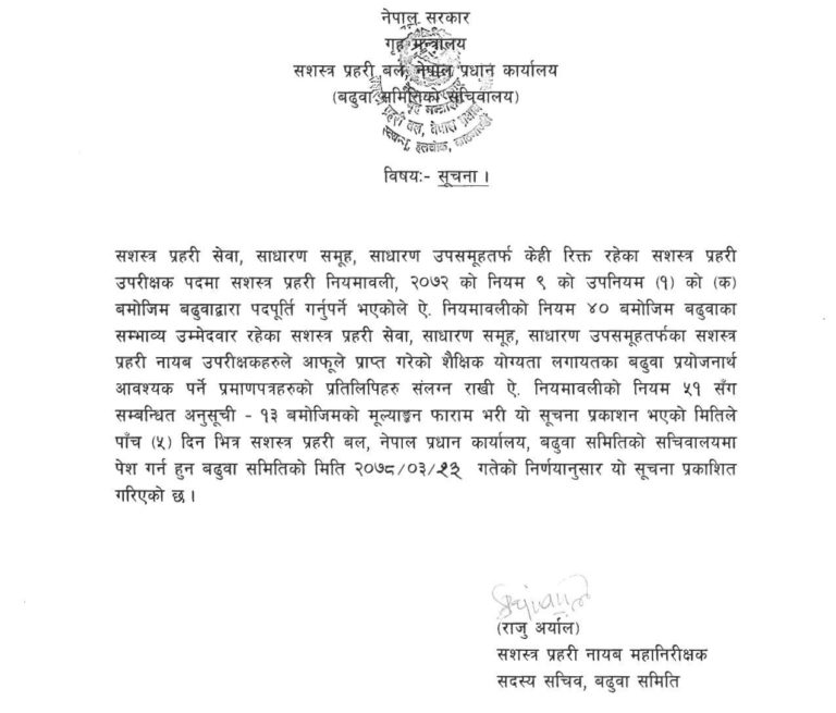 डीआईजी राजु अर्यालले जारी गरेको सूचनामा सशस्त्र प्रहरी नायब उपरीक्षक (डीएसपी)हरूलाई आफूले प्राप्त गरेको शैक्षिक योग्यतालगायत बढुवा प्रयोजनार्थ आवश्यक पर्ने प्रमाणपत्रको प्रतिलिपि पाँच दिनभित्र मुख्यालयको बढुवा समितिको सचिवालयमा बुझाउन भनिएको छ । डीआईजी अर्याल बढुवा समितिका सदस्य सचिव हुन् ।