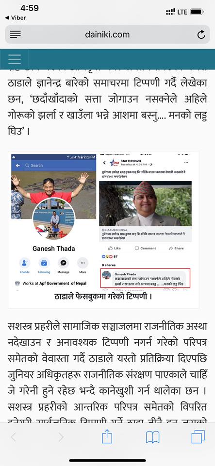 फेसबुकमा पूर्वराजाको आलोचना गर्ने सशस्त्रका एसएसपी कारबाहीमा