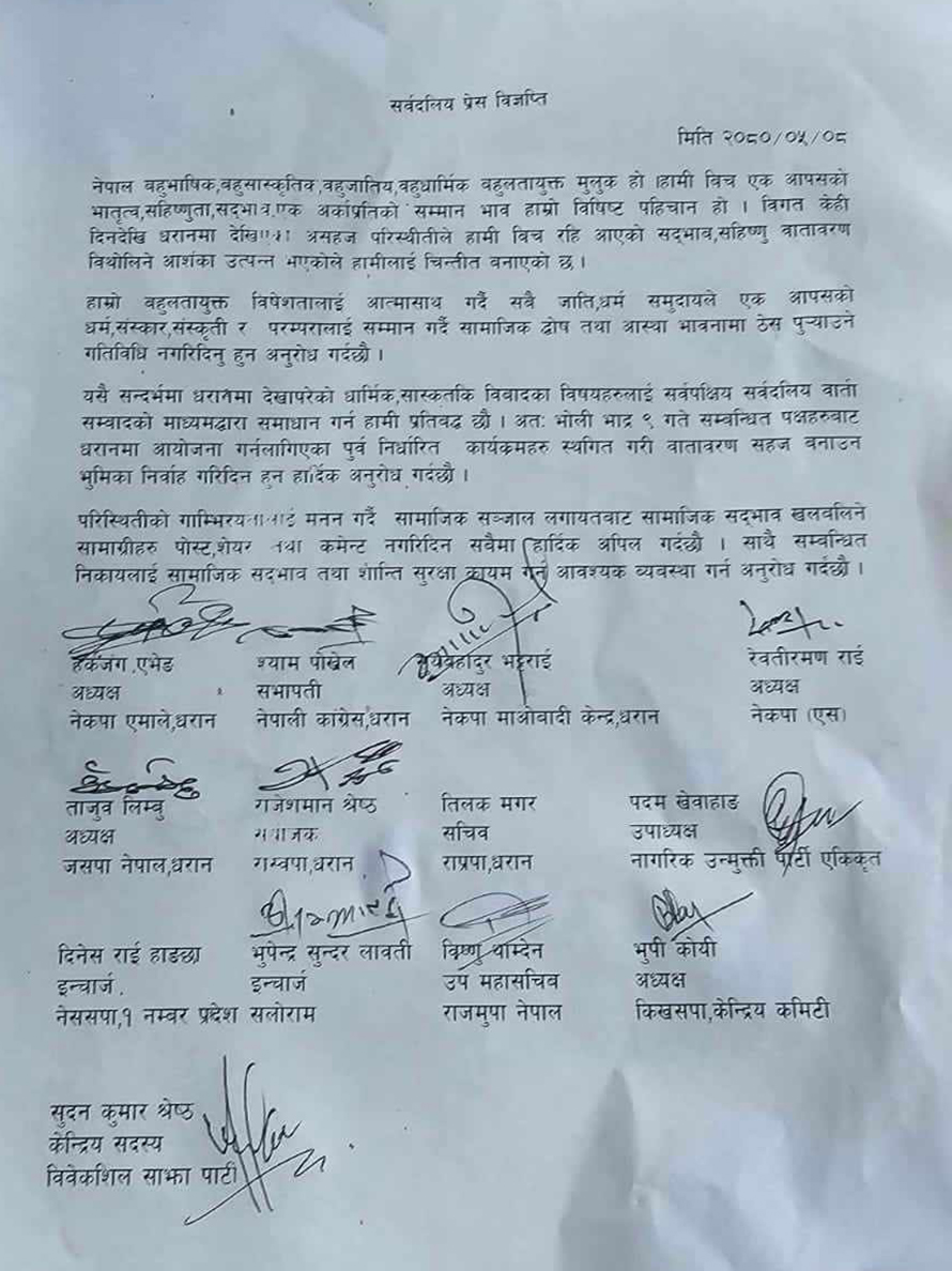 धरानका राजनीतिक दलहरूले संयुक्त हस्ताक्षरसहित शुक्रवार अपिल जारी गरेका छन् ।
