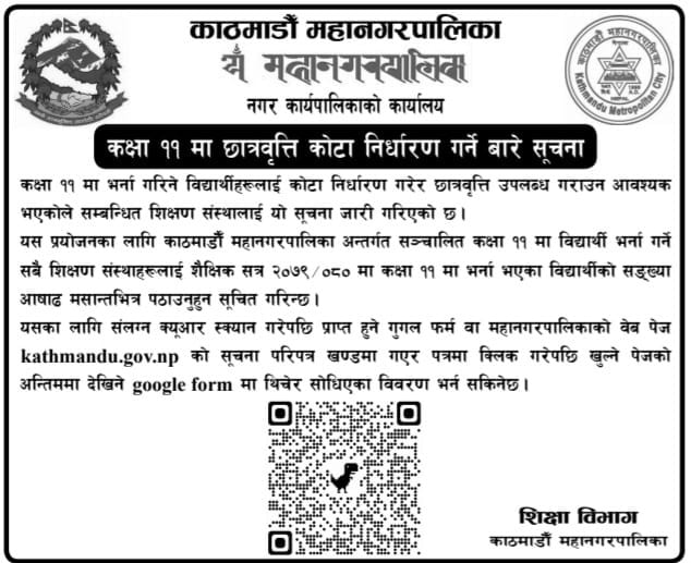 ‘कक्षा ११ मा अध्ययन गर्न चाहने विद्यार्थीहरूलाई काठमाडौं महानगरपालिका भित्र पढ्न चाहने सामुदायिक विद्यालयमा अध्ययन गरेको, जेहेन्दार, पिछडिएको क्षेत्र, जनजाति, आदिवासी, गरिब लगायतका छनोटका आधार तयार गरी योग्यताक्रमका आधारमा कोटा निर्धारण गरेर छात्रवृत्ति उपलब्ध गराउन आवश्यक भएकोले सम्बन्धित शिक्षण संस्थालाई यो सूचना जारी गरिएको छ,’ जारी सूचनामा उल्लेख छ ।