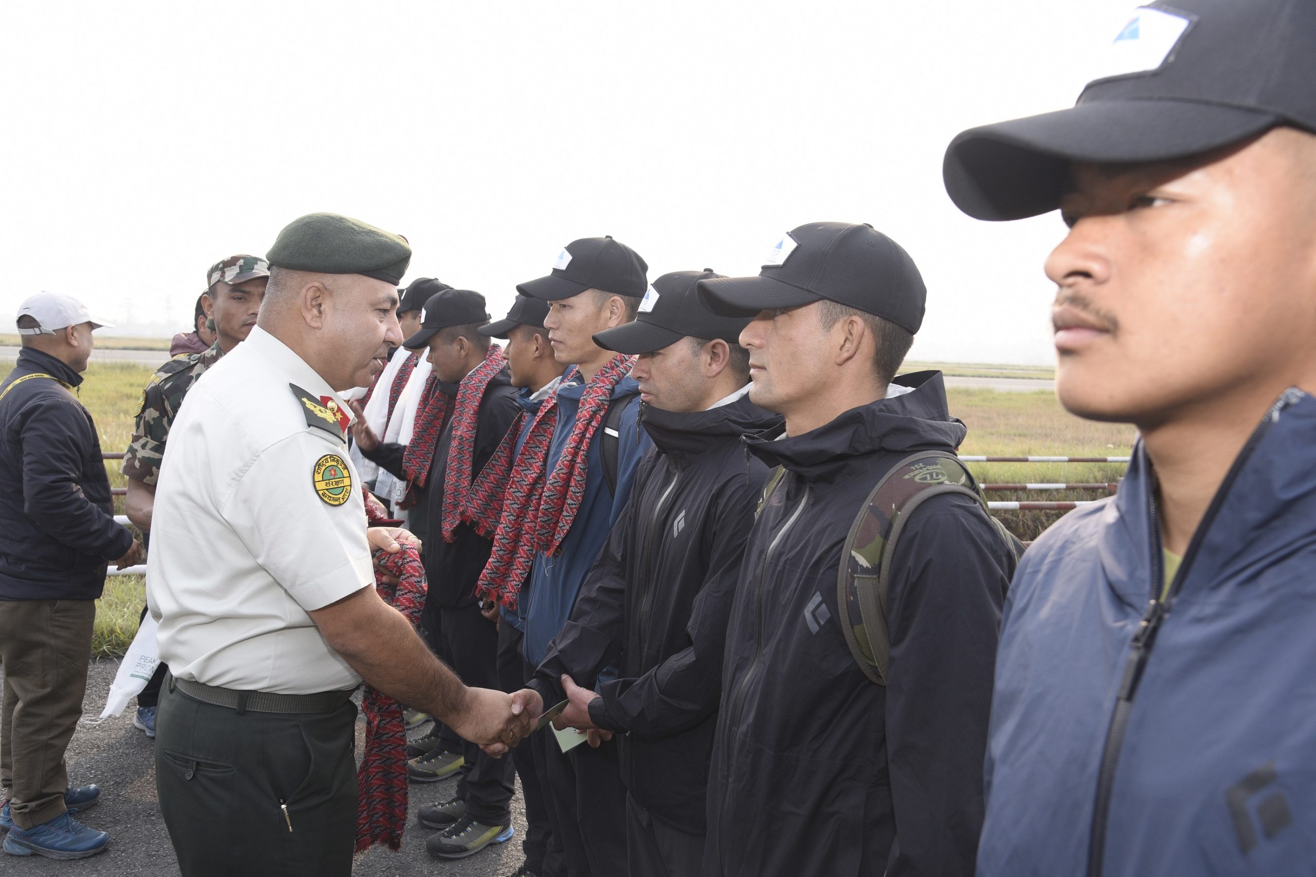 सगरमाथा, ल्होत्से तथा नुप्त्से हिमाल सफाइका लागि १२ जना सैनिक र १ जना शेर्पा सरदारसहित १३ जनाको सफा हिमाल अभियान–२०२४ मा संलग्न टोली नेपाली सेनाको हवाई साधनमार्फत स्याङ्गबोचे इलाकामा पुगेको हो ।