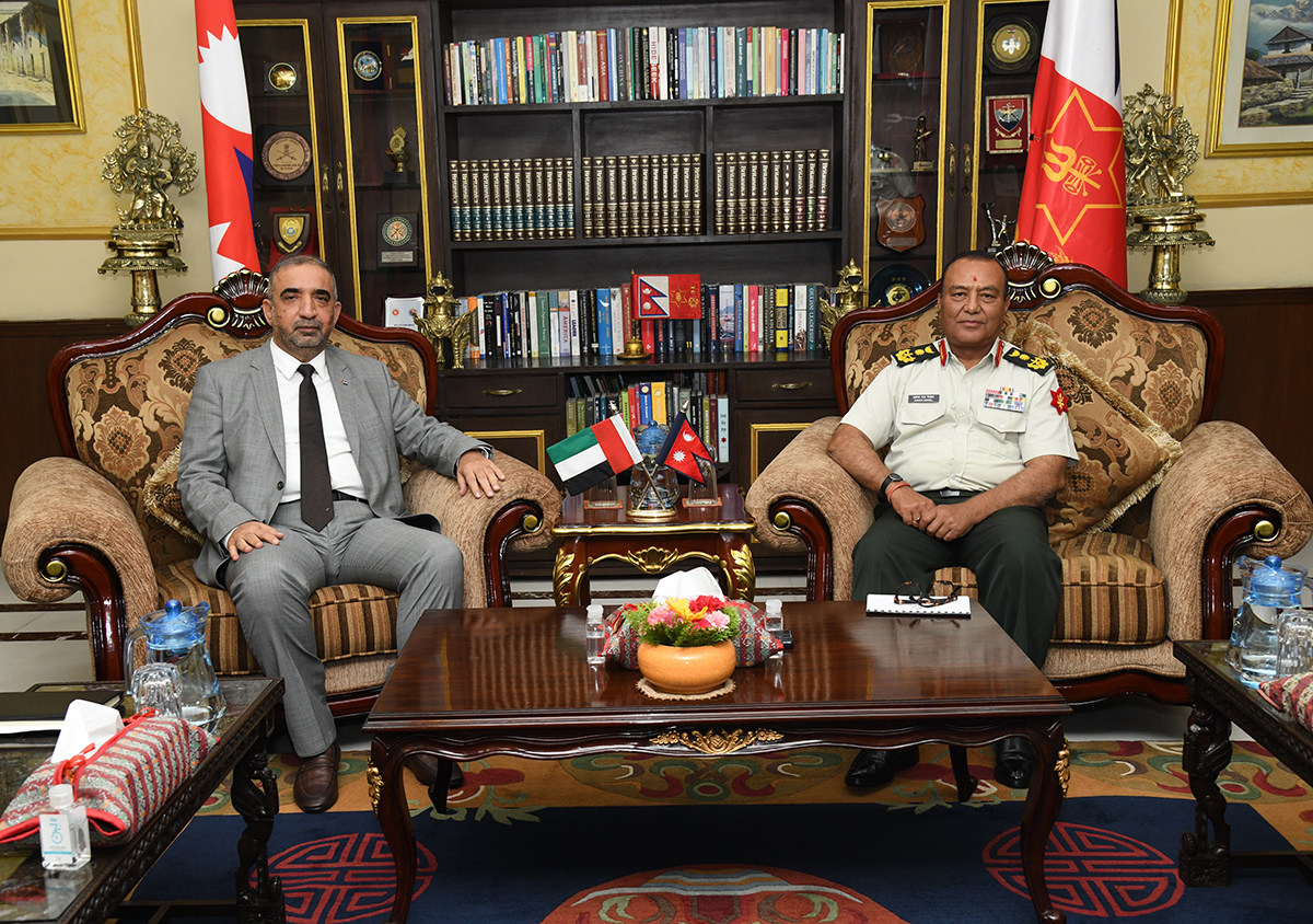 सोमबारै प्रधानसेनापति र नेपालका लागि संयुक्त अरब इमिरेट्स (यूएई) का महामहिम राजदूत अब्दुल साइद मुबारक जर्वान अल शम्सबीच जङ्गीअड्डामा शिष्टाचार भेटघाट भएको छ ।