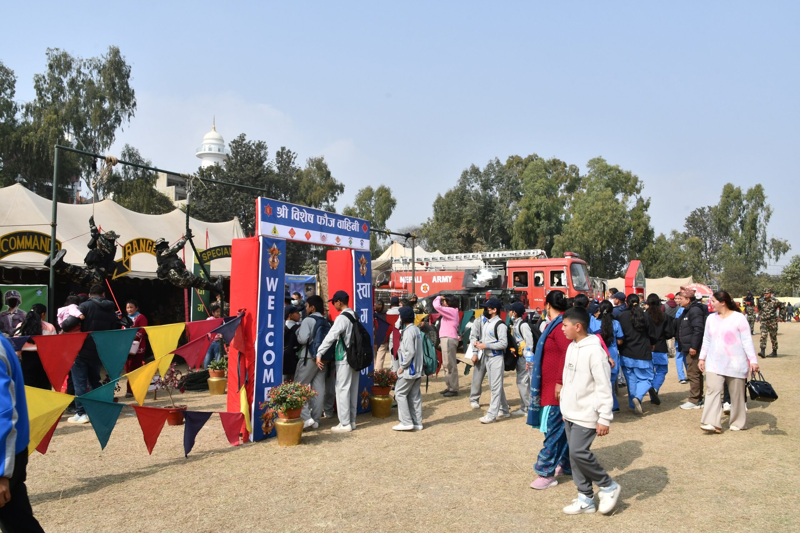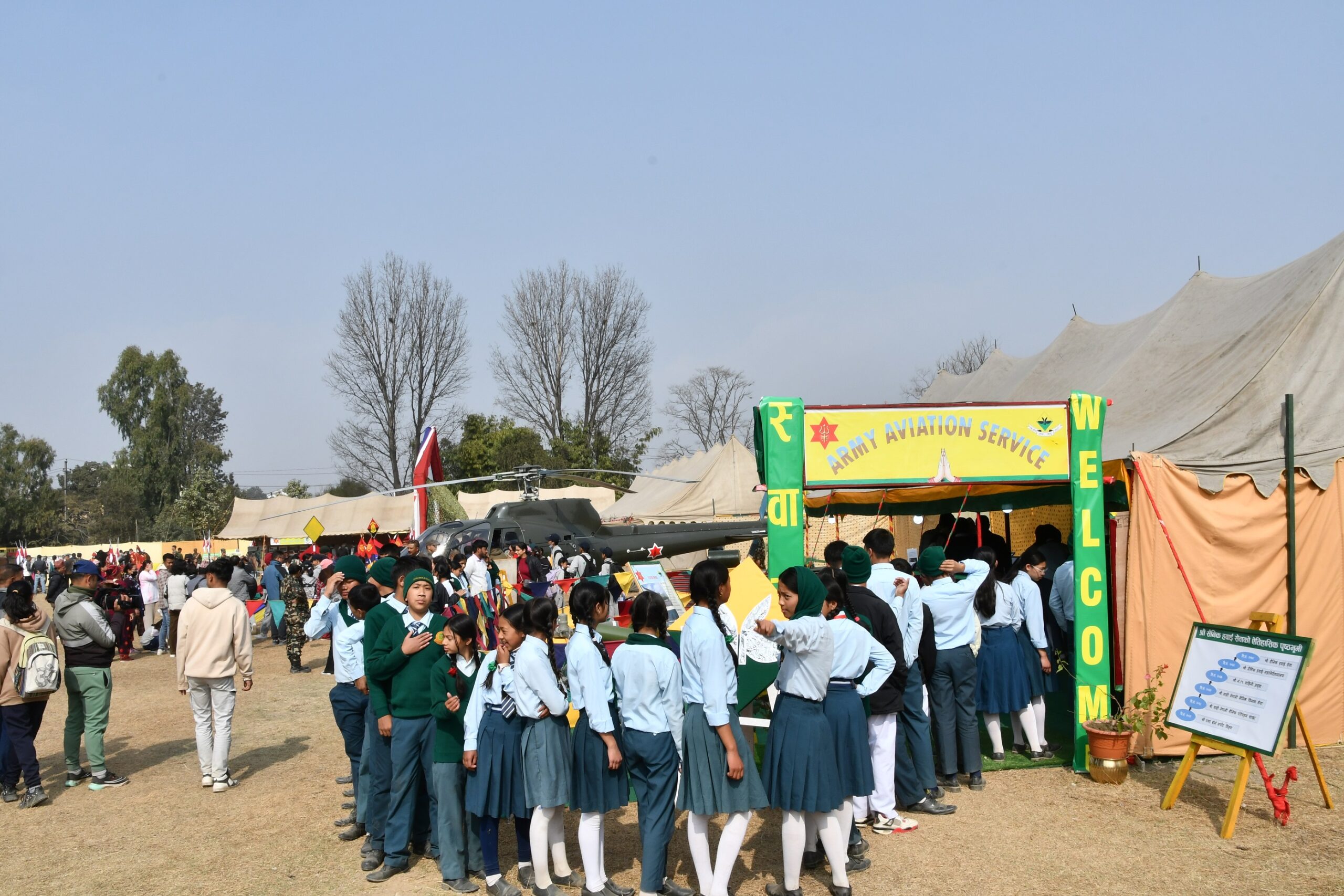 माघ १५–१८ गतेसम्म जङ्गी अड्डा परिसरमा सञ्चालन भएको प्रदर्शनीमा सैनिक पोशाक, सैनिक ब्यान्ड, सैनिक हवाई सेवा, घोडचढी, जङ्गल तथा पहाडी युद्धकला, विशेष फौजको भूमिका, राष्ट्रिय निकुञ्ज तथा वन्यजन्तु आरक्ष संरक्षण, शान्ति सेना, विकास निर्माण, विपद् व्यवस्थापन, खेलकुद, सैनिक विद्यालयहरू, राष्ट्रिय सेवा दल लगायतका गतिविधिहरू समेट्ने गरी कूल २९ वटा स्टलहरू राखिएका थिए ।