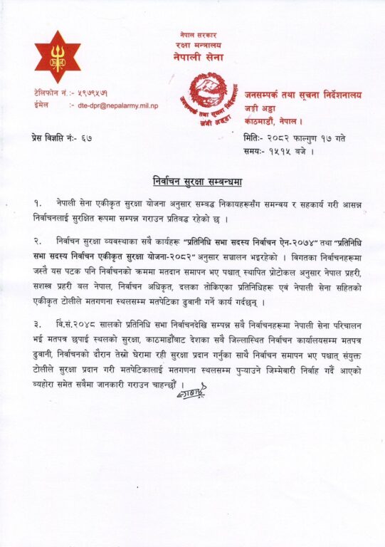 काठमाण्डु – आसन्न प्रतिनिधिसभा सदस्य निर्वाचनलाई भयरहित वातावरणमा सम्पन्न गराउन नेपाली सेनाले एकीकृत सुरक्षा योजना २०८२ अनुसार परिचालन सुरु गरेको छ ।