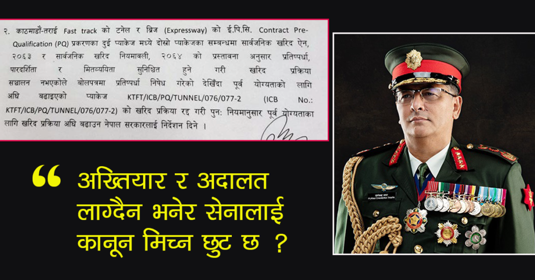 सेनाले कानून मिचेको ठहर गर्दै संसद्को सार्वजनिक लेखा समितिले सेनाको नेतृत्वमा बनिरहेको काठमाडौं–निजगढ फास्ट ट्रयाकमा आर्थिक प्रतिस्पर्धा विना दिन लागिएको २५ अर्बको ठेक्का प्रक्रिया रोक्न निर्देशन दिएको छ ।