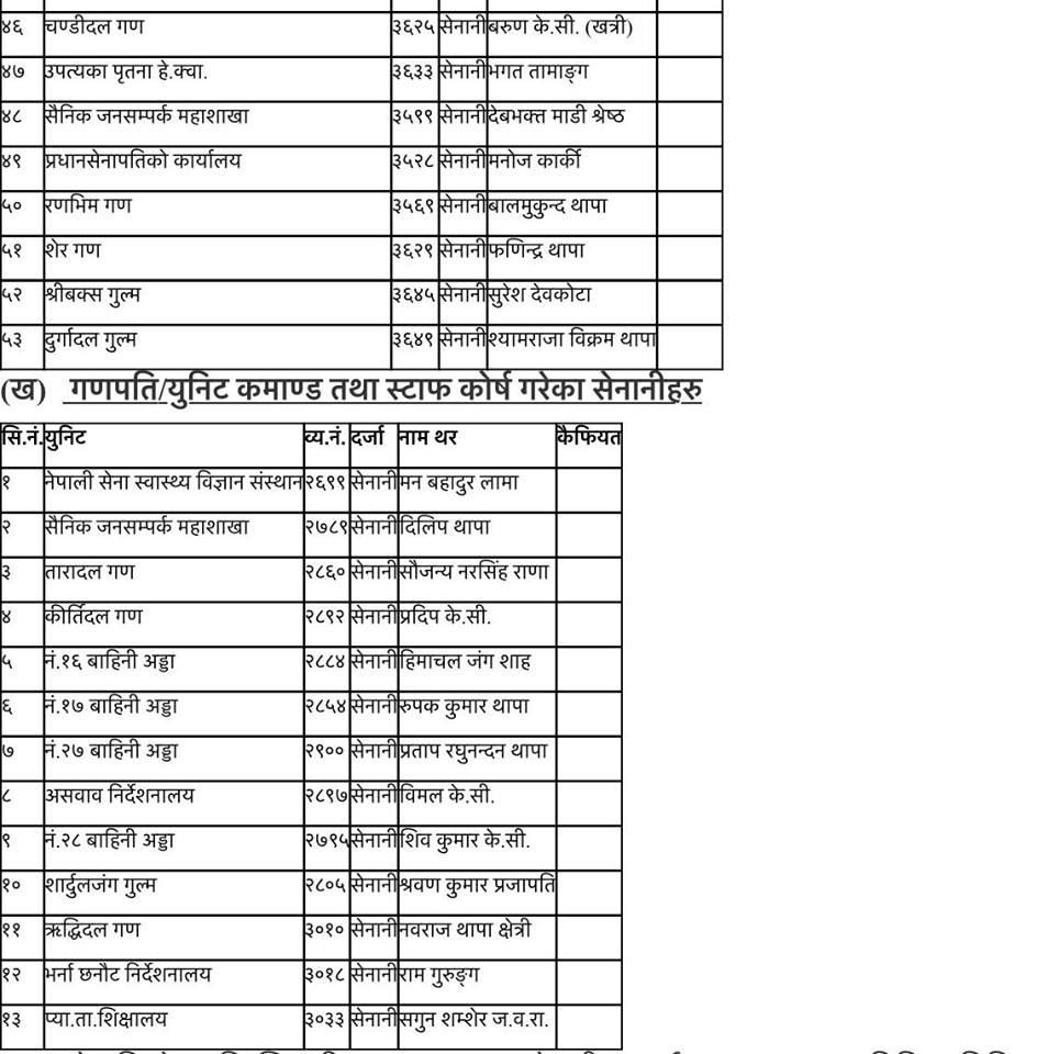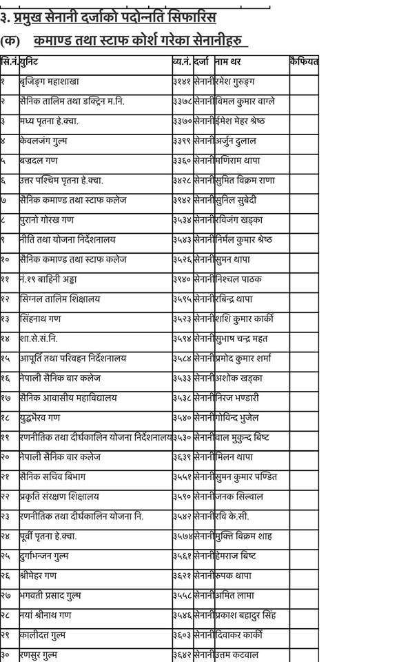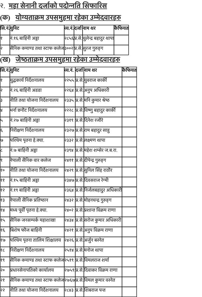 महासेनानीमा बढुवा सिफारीस हुनेमा प्रमुख सेनानीहरु चुलेन्द्र बहादुर थापा,सुरुज गुरुंग, युवराज कार्की र अनुप अधिकारीलगायत छन् । महासेनानी र प्रमुख सेनानीमा बढुवा सिफारीस भएकाहरुलाई २०७७ सालमा रिक्त हुन आउने पदअनुसार बढुवा गर्ने सेनाको तयारी छ ।