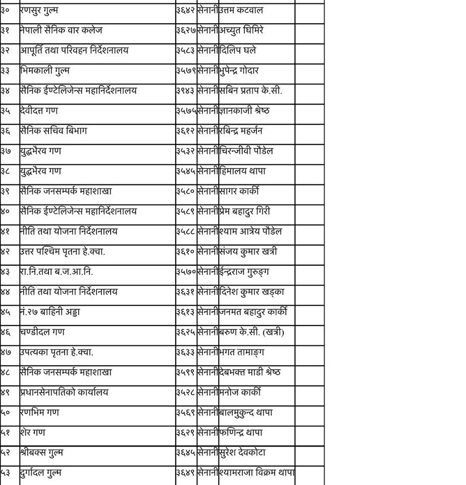 काठमाडौं – नेपाली सेनाले २४ जना प्रमुख सेनानीलाई महासेनानी र ६६ जना सेनानीलाई प्रमुख सेनानीमा बढुवा सिफारीस गरेको छ । सैनिक सचिव सहायकरथी विनय विक्रम राणाले रिक्त पदमा पदोन्नती सिफारीस गरेको हुंदा जानकारीका लागी ७ दिने सुचना प्रकाशित गरेका हुन् । सेनाले बढुवाको लागी बलाध्यक्षरथी गौरव तण्डुलको अध्यक्षतामा बोर्ड गठन गरेको थियो । उक्त बोर्डमा उपरथीहरु सिताराम खड्का, गोकुल भण्डारी सदस्य र सुर्वण शाह सदस्य सचिव रहेका थिए ।