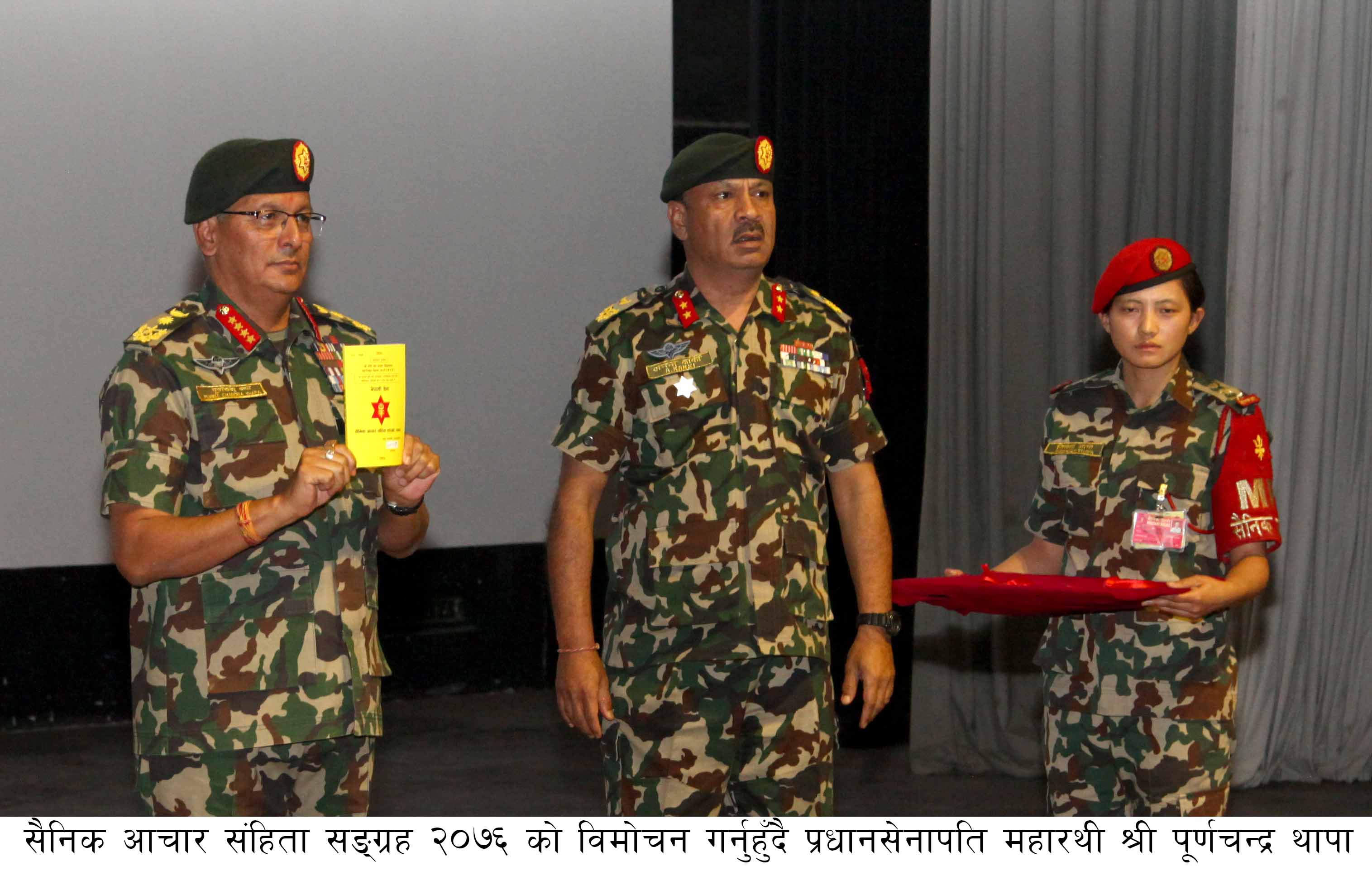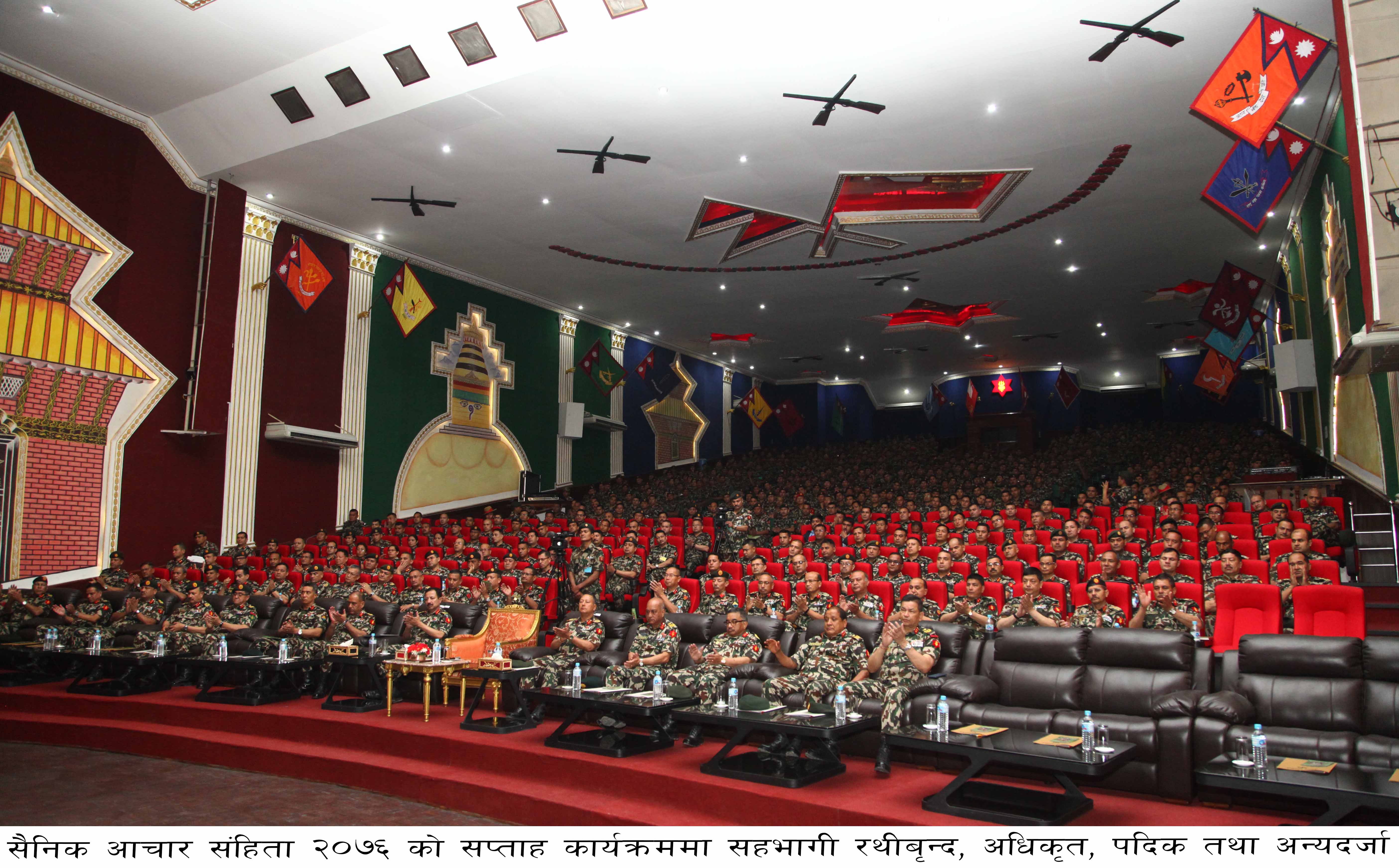 नेपाली सेना भनेको ‘चेन अफ कमाण्ड’ र पद्धतिमा चल्ने तथा अनुशासन र बलिदानमा मान्यता राख्ने सङ्गठनका रुपमा राष्ट्र र जनताहितका खातिर बफादार भइ काम गरिरहेको सो अवसरमा जानकारी दिइयो । सेनाले प्रत्येक वर्ष पहिलो महीनाको पहिलो साता आचारसंहिता सप्ताह मनाउने घोषणा गरेको छ । उक्त सप्ताहका क्रममा सेनाका सकल दर्जालले गर्नुपर्ने, गर्न हुने र गर्न नहुने एवं आर्थिक पारदर्शीता, भर्ना छनोट, राजनीतिक भेटघाट, सार्वजनिक अभिव्यक्ति दिँदा हेक्का राख्नुपर्नेबारे मुख्यालयदेखि तल्ला तहको निकायसम्म प्रशिक्षण दिने भएको छ । प्रधानसेनापति थापाले आचारसंहितासम्बन्धी पुस्तक पनि लोकार्षण गर्नुभयो ।