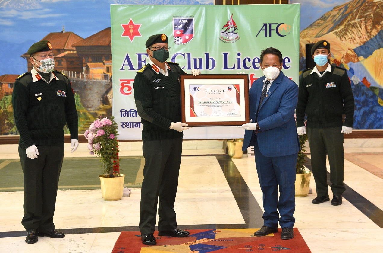 एन्फाले नेपालका सबै ‘ए’ डिभिजन क्लबलाई एएफसी लाइसेन्स प्रक्रिया पूरा गर्न निर्देशन दिए पनि आर्मी क्लबबाहेक कुनै पनि क्लबले मापदण्ड पूरा गर्न सकेका छैनन् । त्रिभुवन आर्मी फुटबल क्लब एएफसी लाइसेन्स प्राप्त गर्ने नेपालकै पहिलो क्लब हो । क्लब लाइसेन्स हस्तान्तरण कार्यक्रममा राष्ट्रिय खेलकूद परिषद् (राखेप) का सदस्यसचिव रमेशकुमार सिलवालले आर्मी क्लबले उक्त लाइसेन्स प्राप्त गर्नु सिङ्गो मुलुकको खेलकूद क्षेत्रकै सफलता भएको बताए ।
