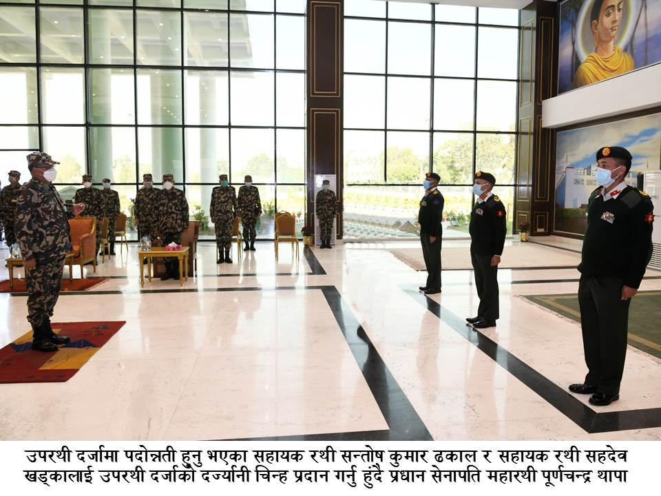 मंसिर ०३ गतेको मन्त्रीपरिषद्को निर्णय अनुसार उपरथी दर्जामा पदोन्नति भएका सहायकरथीहरु सन्तोष कुमार ढकाल र सहदेव खड्कालाई प्रधानसेनापति थापाले शुक्रवार जङ्गी अड्डामा आयोजित एक कार्यक्रमकाबीच उपरथी दर्जाको दर्ज्यानी चिन्ह प्रदान गरेका हुन् ।