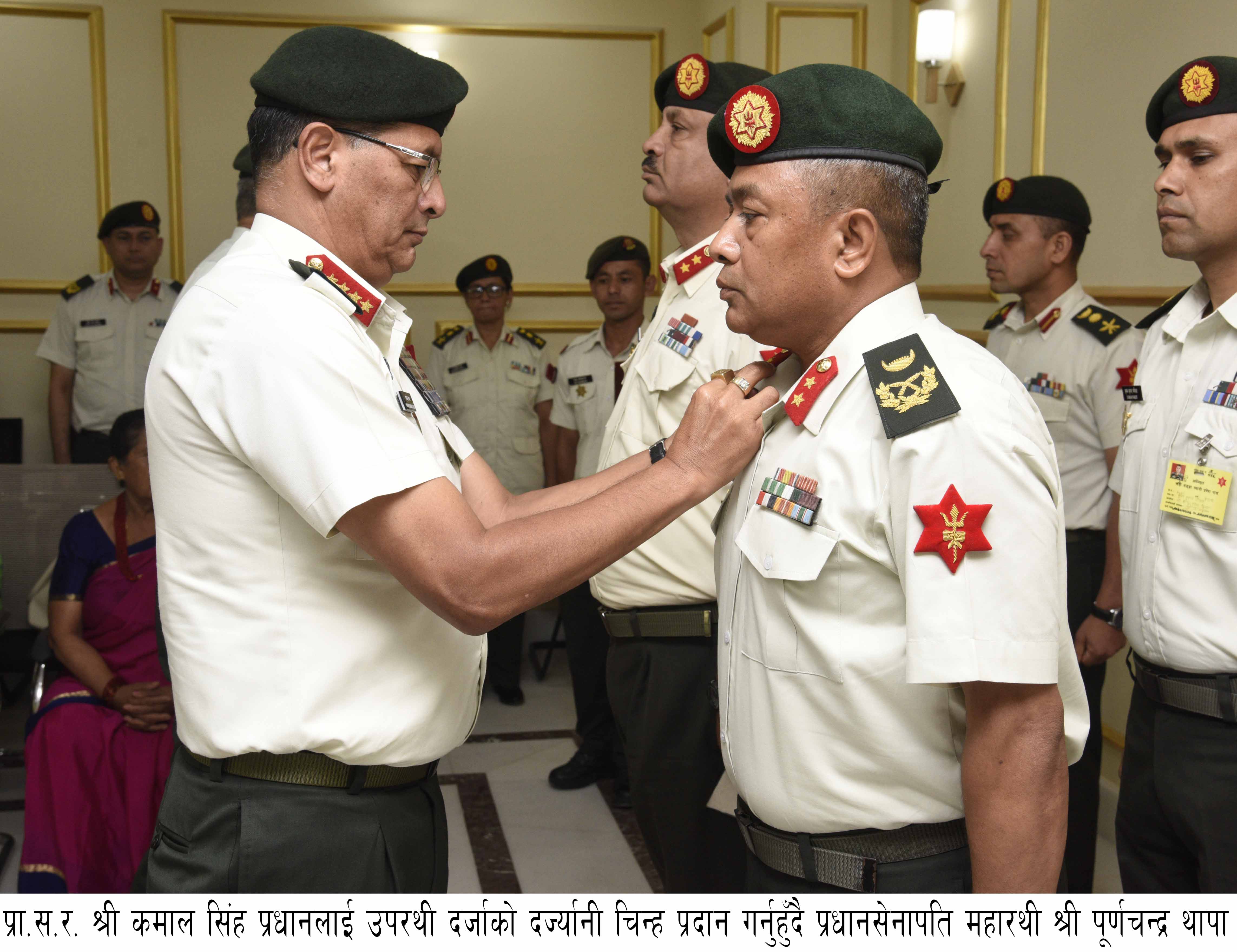 प्राविधिक उपरथी दर्जामा पदोन्नति भएका स्थपति निर्देशनालयका निर्देशक प्राविधिक सहायक रथी प्रधानलाई जंगी अड्डामा आयोजित एक विशेष समारोहका बीच प्रधानसेनापति पूर्णचन्द्र थापाले उपरथी दर्जाको दर्ज्यानी चिन्ह प्रदान गरेका थिए ।