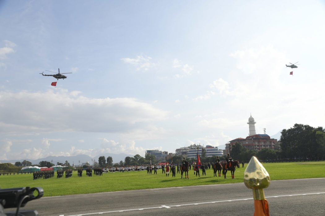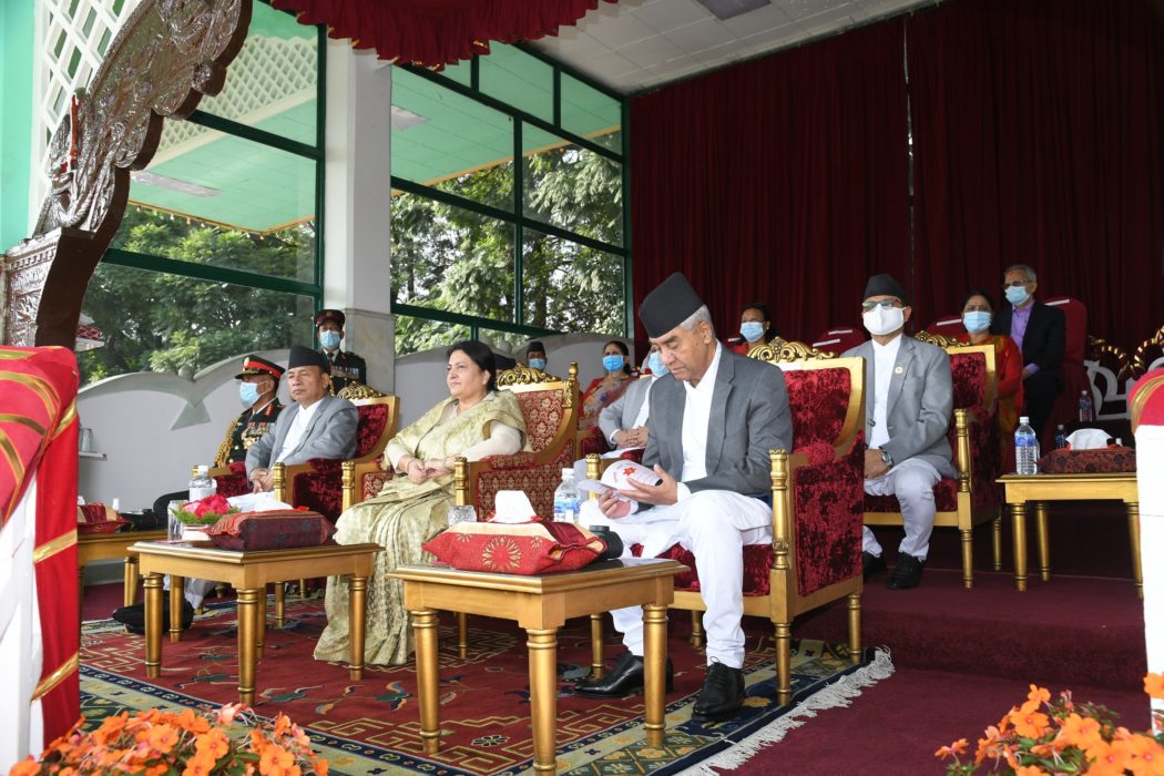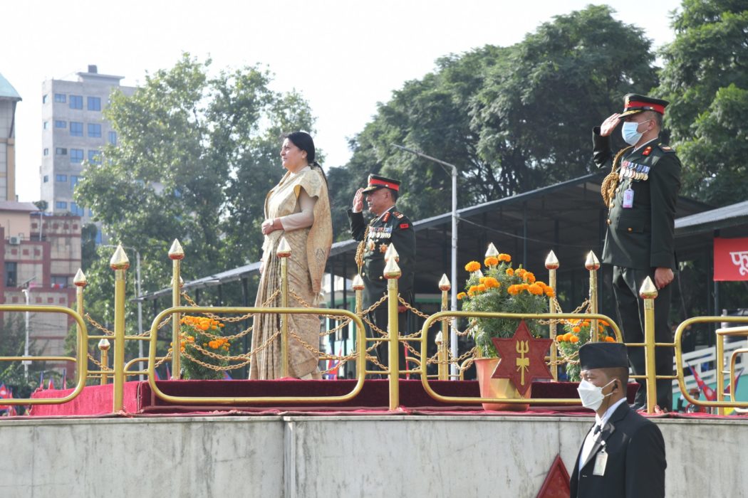 काठमाण्डु – सैनिक मञ्च टुँडिखेलमा नेपाली सेनाद्वारा आयोजित फूलपाती बढाइँ समारोह सम्पन्न भएको छ । बडा दशैं २०७९ को उपलक्ष्यमा फूलपाती बढाइँ कार्यक्रम सम्पन्न भएको हो । कार्यक्रममा राष्ट्रपति एवं नेपाली सेनाका परमाधिपति विद्यादेवी भण्डारी प्रमुख अतिथिको रुपमा सहभागी भईन ।