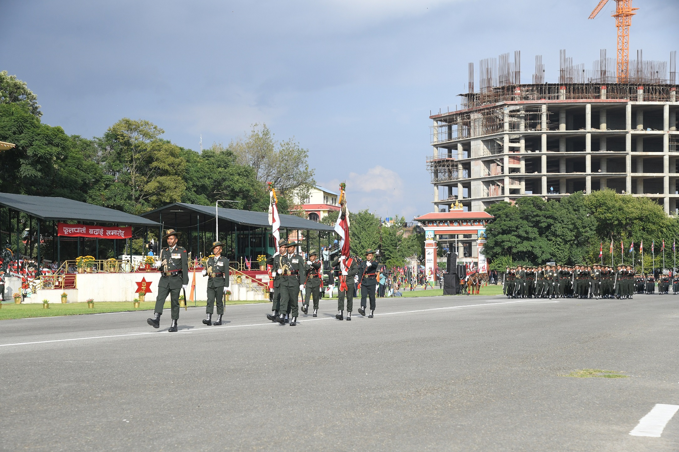 कार्यक्रमको प्रारम्भमा प्रमुख अतिथि राष्ट्रपतिमा नेपाली सेनाको सम्मान गारतले सलामी अर्पण गरे पश्चात नेपाली सेनाको हेलिकप्टरबाट नेपाली र अंग्रेजी भाषामा “फूलपाती बढाइँ समारोह–२०७९“ लेखिएको व्यानर प्रदर्शन र पुष्पवृष्टि गरिएको थियो ।