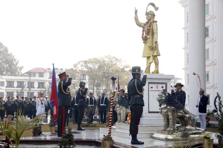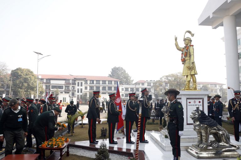 काठमाडौं – नेपाली सेनाले २९८औँ पृथ्वी जयन्ती तथा राष्ट्रिय एकता दिवसको अवसरमा सैनिक मुख्यालय जङ्गी अड्डाको मुख्य भवन अगाडि अवस्थित राष्ट्र निर्माता पृथ्वीनारायण शाहको शालिकमा पुष्पहार अर्पण गरेको छ ।