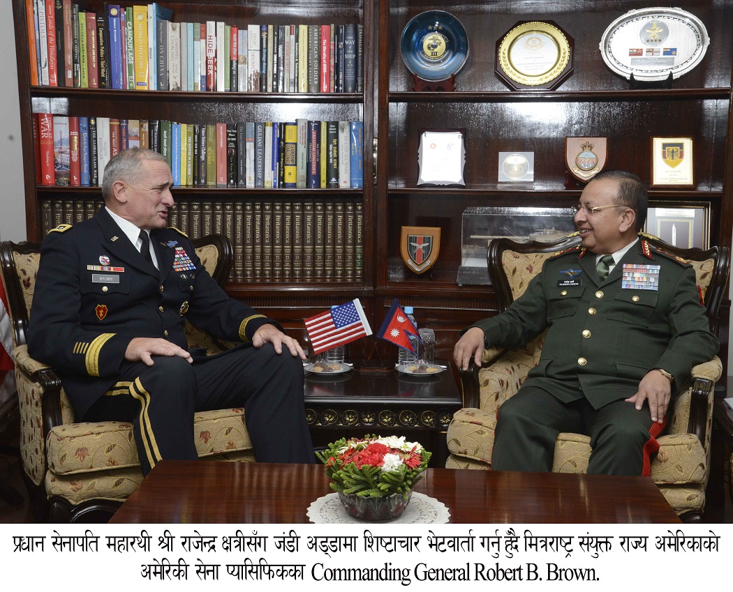 काठमाडौं– प्रधान सेनापति राजेन्द्र क्षत्री र अमेरिकी सेना प्यासिफिकका कमाण्डका जनरल रोवर्ट बी ब्राउनबीच भेटवार्ता भएको छ।