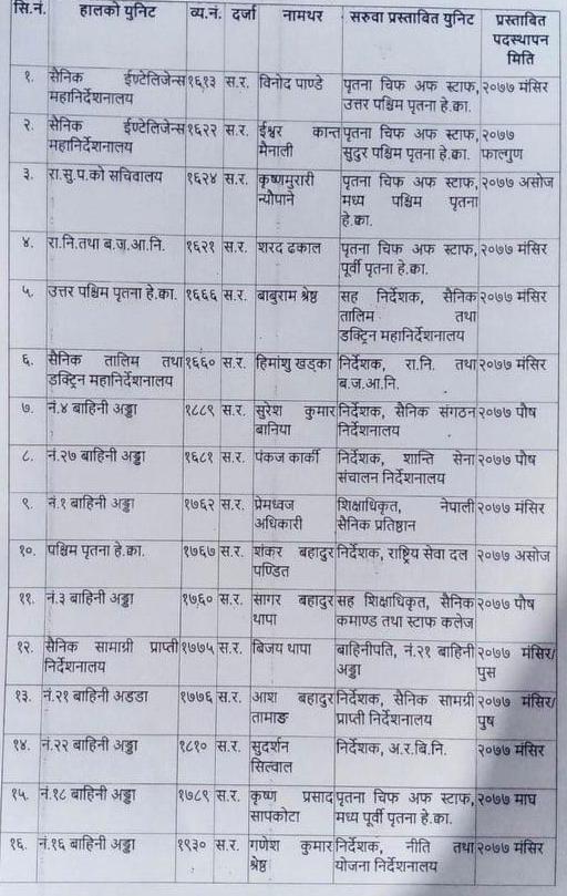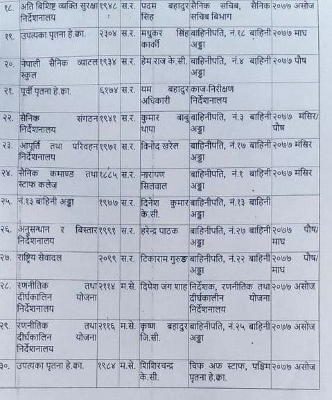 काठमाडौं- नेपाली सेनाका २७ जना सहायकरथी र ३ जना महासेनानीहरुको सरुवा भएको छ । सैनिक मुख्यालयले विहिवार सैनिक अधिकारीहरुको सरुवा गरेको हो । सैनिक मुख्यालयले गरेको सरुवामा सहायकरथी पदम बहादुर सिंहलाई सैनिक सचिवको जिम्मेवारी मिलेको छ ।