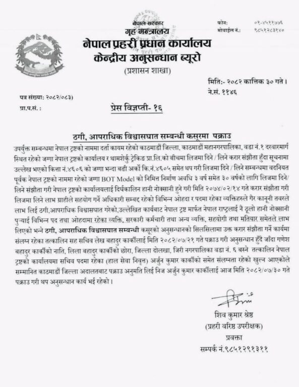 जग्गा लिज प्रकरणमा नेपाल ट्रस्टका पूर्वसचिव कार्की पक्राउ