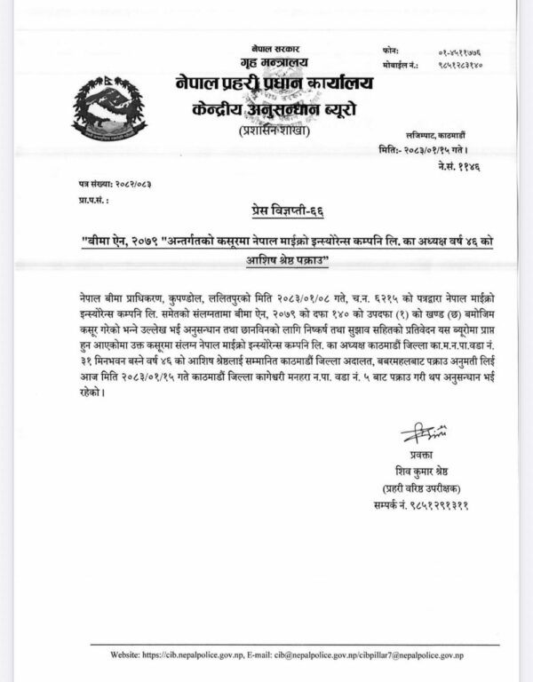 काठमाण्डु – बिमा ऐन विपरीत कार्य गरेको कसूरमा प्रहरीले नेपाल माइक्रो इन्स्योरेन्सका अध्यक्ष आशिष श्रेष्ठ पक्राउ गरेको छ ।