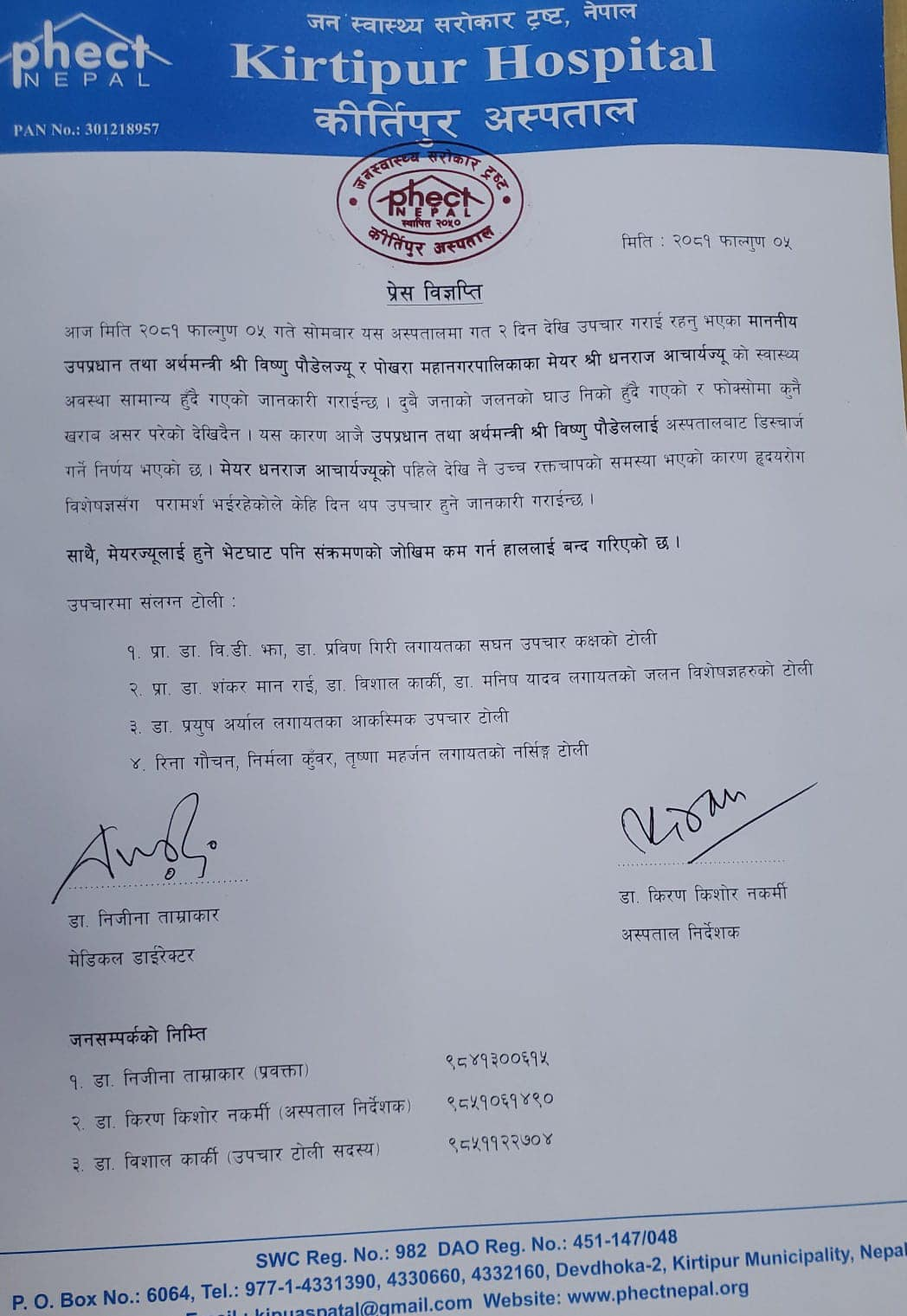 यस्तै पोखरा महानगरपालिकाका मेयर धनराज आचार्यलाई भने केही दिन अस्पताल राखिने भएको छ ।