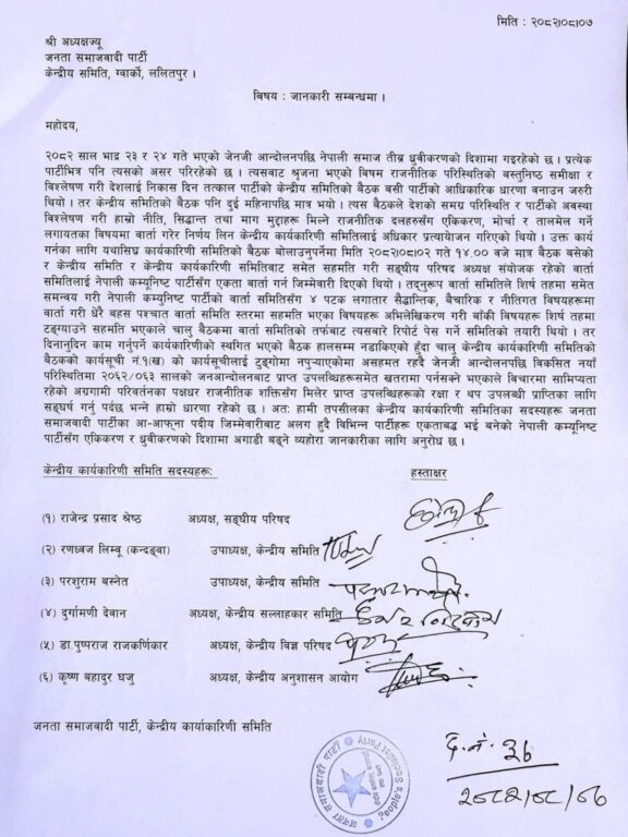विज्ञप्तिमा विचार मिल्ने राजनीतिक शक्तिसँग मिलेर संविधान र परिवर्तनका उपलब्धि जोगाउन संयुक्त रूपमा अघि बढ्नुपर्ने आवश्यकता देखिएको भन्दै नेकपाको मार्ग रोजेको उल्लेख गरिएको छ । आफ्नो निर्णयबारे अध्यक्ष अशोक राईलाई समेत औपचारिक रूपमा जानकारी गराएको जनाइएको छ ।