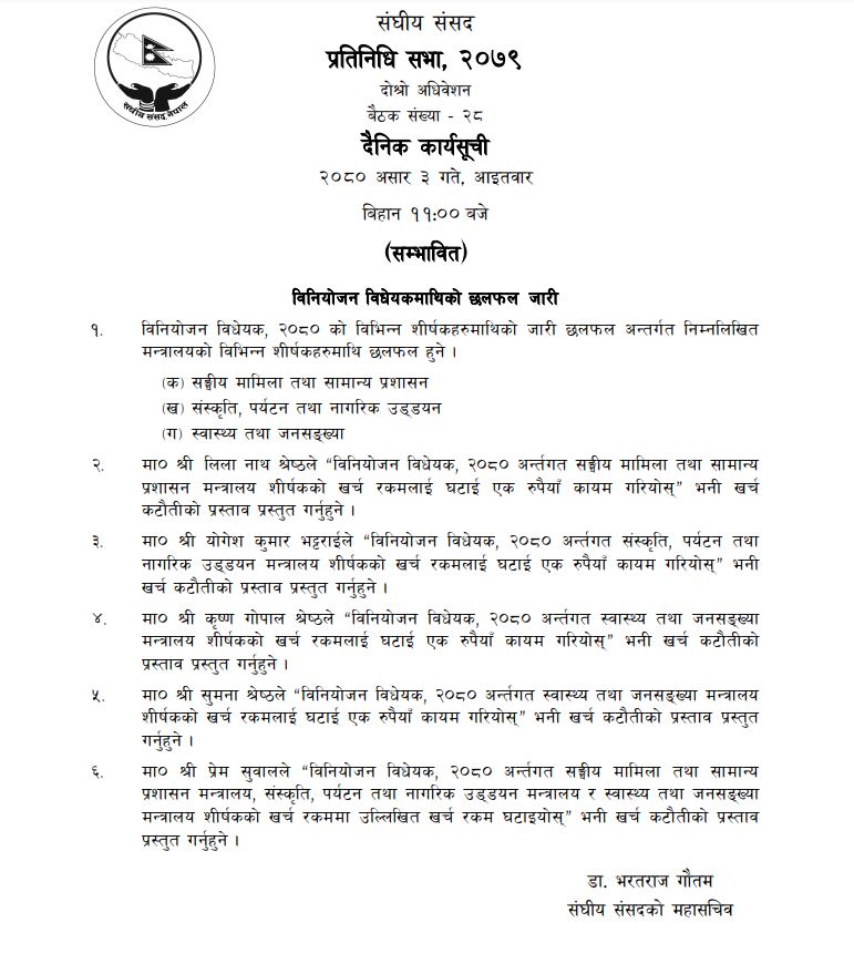 सम्भावित कार्यसुची अनुसार आजको बैठकमा लिलानाथ श्रेष्ठ र प्रेम सुवालले संघीय मामिलाको, योगेश भट्टराईले पर्यटन मन्त्रालयको, कृष्णगोपाल श्रेष्ठ र सुमना श्रेष्ठले स्वास्थ्य मन्त्रालयको शिर्षकको रकमलाई घटाई एक रुपैयाँ कायम गरियोस भन्ने प्रस्ताव गर्नेछन् ।