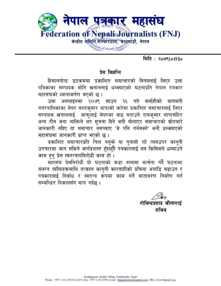 हिमाल पोस्ट अनलाइनमा २०७९ साउन २६ गते सर्लाहीको बागमती नगरपालिकाका मेयर भरतकुमार थापाको बारेमा प्रकाशित समाचारलाई लिएर सम्पादक खनाललाई आफूलाई मेयरका भाइ बताउने रामकुमार थापासहित अन्य तीन जना व्यक्तिले थप सूचना दिने भनी बोलाएर समाचारको स्रोतबारे जानकारी नदिए या समाचार नसच्याए ‘जे पनि गर्नसक्ने’ भन्दै धम्क्याएको घटनाको महासंघले विज्ञप्ति जारी गर्दै भर्त्सना गरेको छ ।